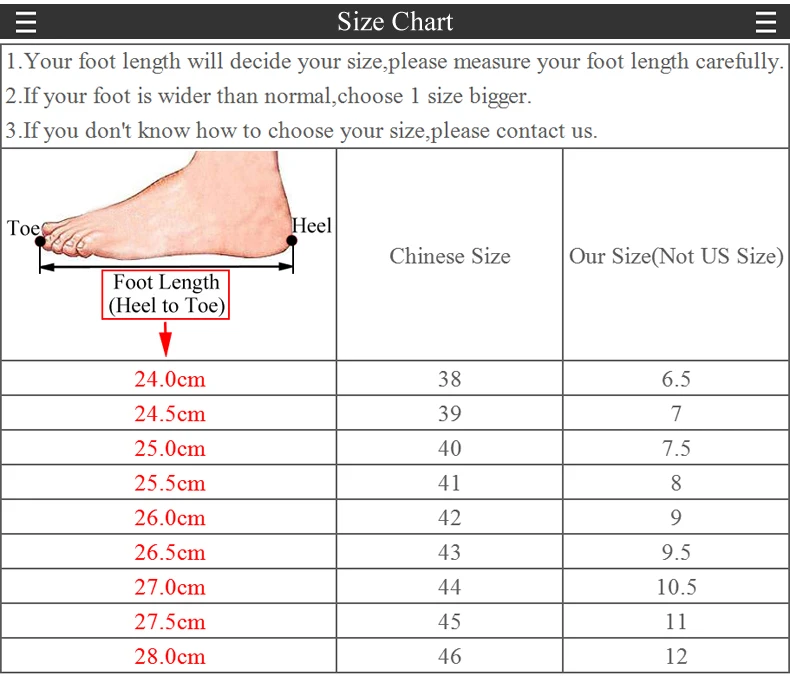 1. Измерение длины стопы является наиболее важным способом выбора правильного размера. Длина стопы не соответствует длине стельки. Длина стопы не соответствует длине подошвы. Длина стопы <длина стельки <длина подошвы 2. Новая обувь может иметь запах клея, пожалуйста, поймите. 3. Фото может быть ярким, но реальный продукт может быть немного темным, пожалуйста, поймите разницу. 4. Мы упаковываем обувь в пенополиэтиленовый пакет, что может сделать обувь немного мятой, пожалуйста, поймите. 5. Если вы считаете, что наше качество не очень хорошее, пожалуйста, обратитесь за помощью в нашу службу поддержки клиентов.