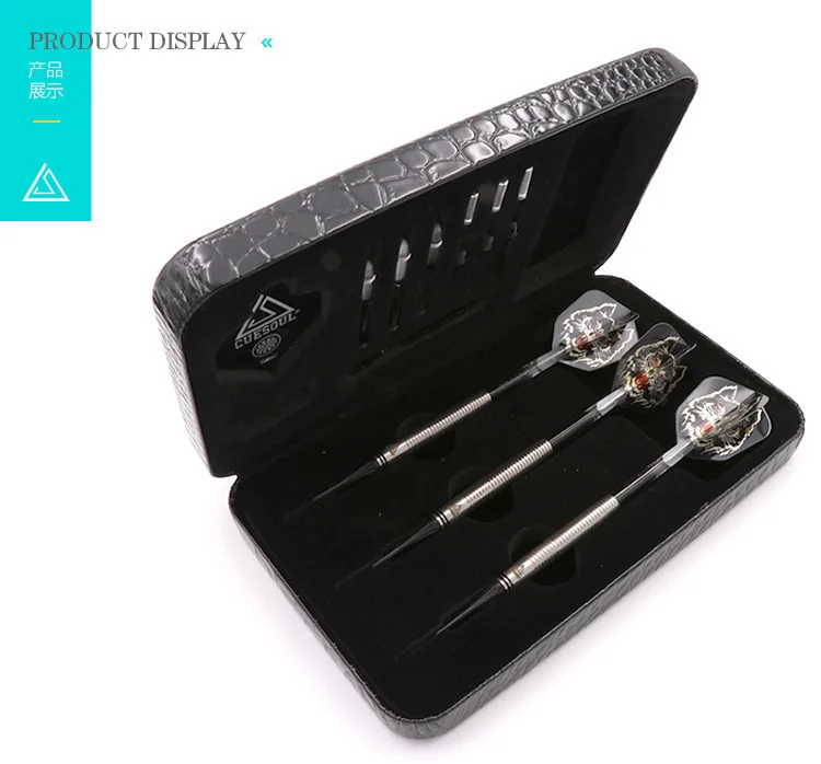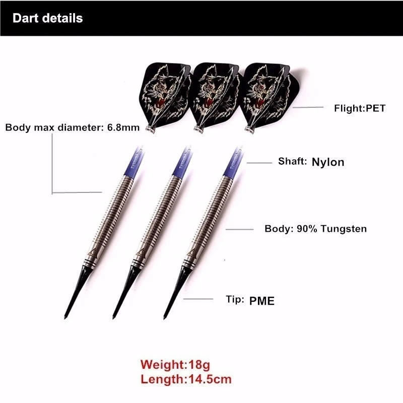 Dart Barrel: 90% TungstenDart tip: PMEDart Shaft: NylonDart Flight: PETDart barrel max diameter: 6.8mmTotal weight: 18g (including tip, barrel, shaft , flight )Total length: 14.5cmLeather case packaging including:3×darts9× flights3×Nylon shafts3 × dart protectors3 × dart soft tips1 × dart sharpener1 × dart tool1 × leather case (You can leave message to choose box color, black, brown, pink)