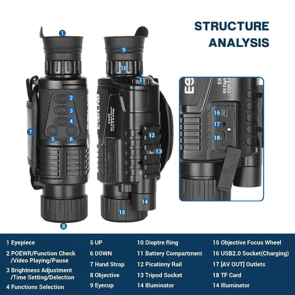 Инфракрасная охотничья камера 5X40: цифровой Монокуляр с CMOS-датчиком обеспечивает четкий обзор До 5X оптического увеличения и 1-8X цифрового зума с объективом 40 мм. Встроенный инфракрасный осветитель позволяет наблюдать за мишенью в абсолютно темном состоянии и дальностью до 656 футов. Вспомогательное освещение CCD сохраняет четкое и яркое изображение. В течение дня или при слабосветильник расстояние наблюдения бесконечно. Регулируемый диоптрийный окуляр и наглазник можно сложить вниз для наблюдения за очками.