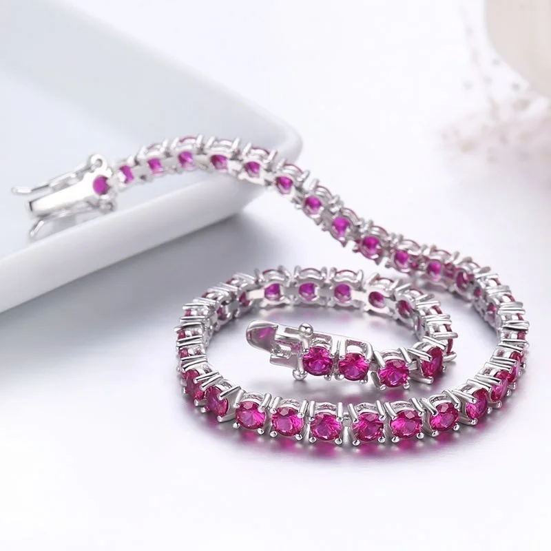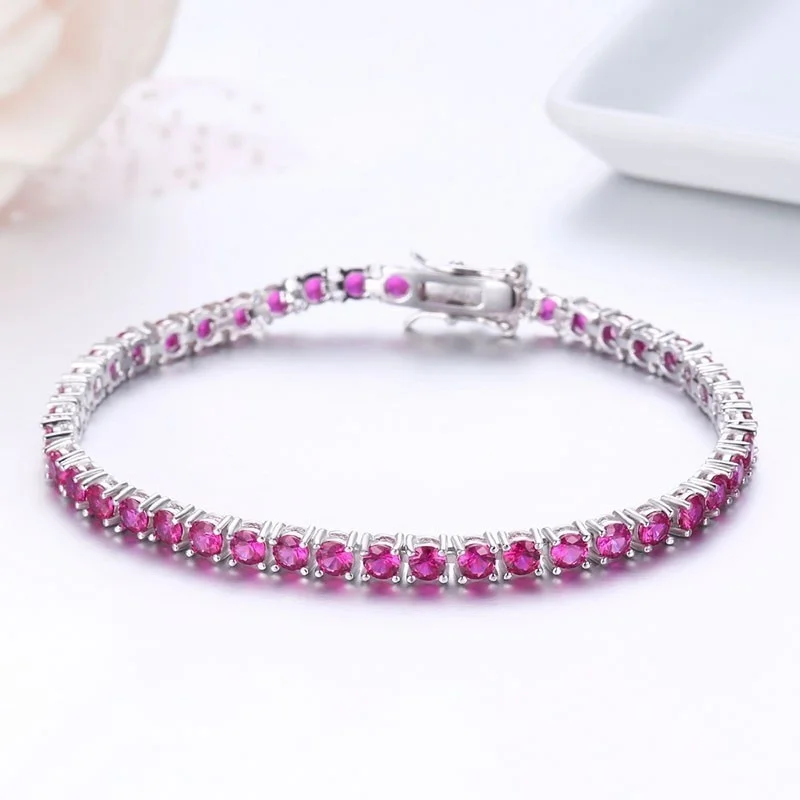 3mm 925 Sterling Silver Round Rose Red Synthetic Ruby Tennis Bracelets Pulseras Pulseira Bracelete Women Jewelry Girl Friend