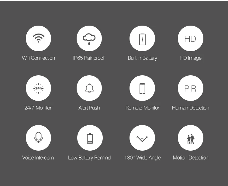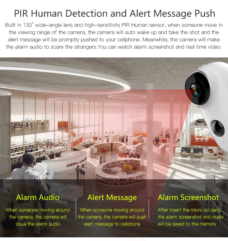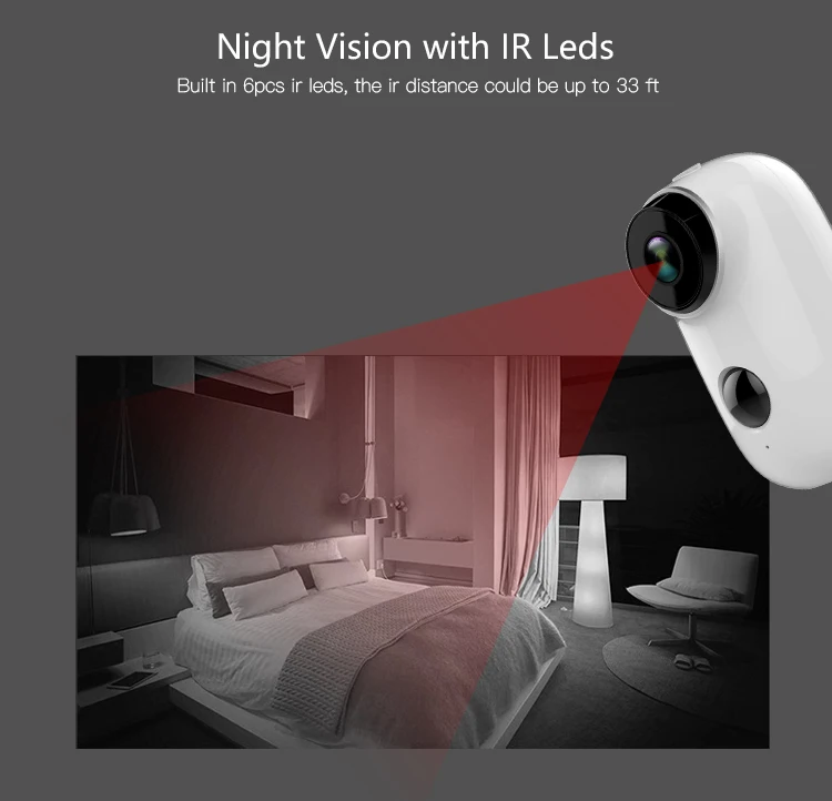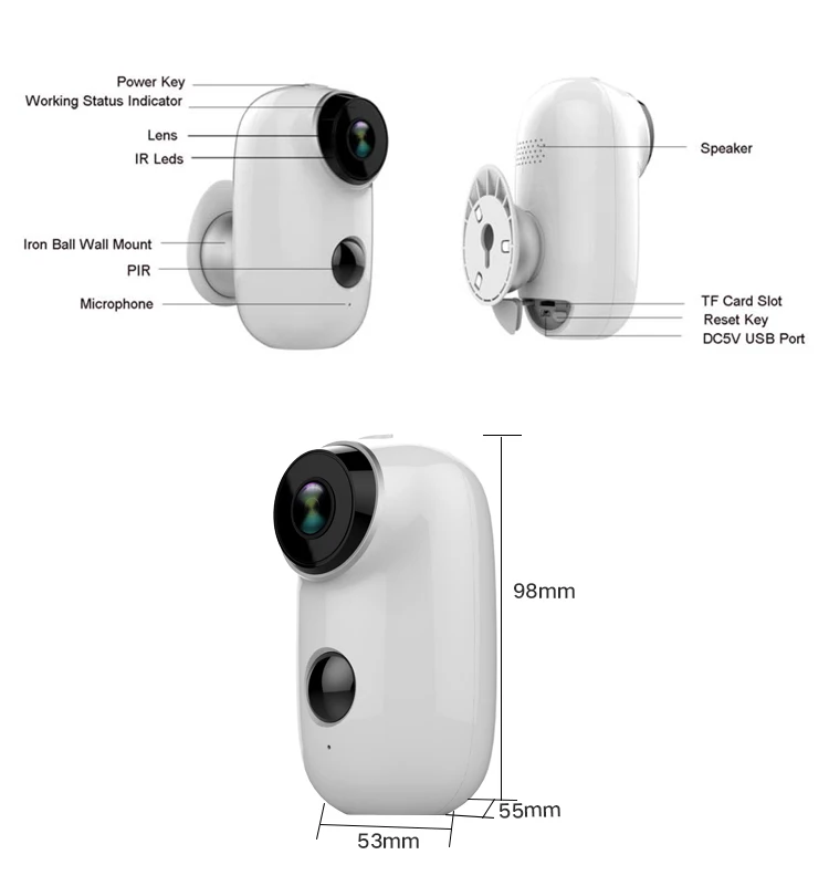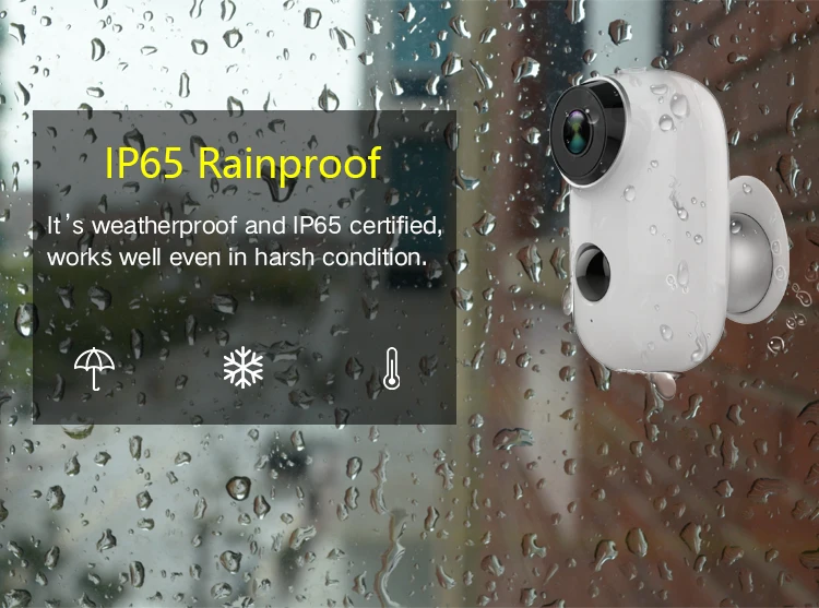 100% безпроводная ip-камера HD1080P 6000ма (2 шт. 18650 аккумуляторная батарея) Время работы в режиме ожидания батареи: 10 месяцев Время использования батареи: 4 месяца (10 раз триггера/день) 8 m PIR, 10 m IR день/ночь, IP65 Водонепроницаемый, приложение: Cloudedge Основные характеристики: 1. Защита от атмосферных воздействий для наружного/внутреннего использования Всепогодный дизайн предлагает вам почти не ограниченное размещение! Вы можете разместить безпроводную камеру безопасности на полке или других плоских поверхностях, в детской комнате, комнате для домашних животных, гараже, на дереве и т. д. или установите камеру на стену, внутри или снаружи, она может отлично работать в солнечные сезоны. 2.Ночное видение Full HD Смотрите все в деталях с истинным разрешением 1080 P Full HD. Получайте более четкие и четкие изображения/видео, чем у других ip-камер Wi-Fi. С исключительным ночным видением 10 м вы можете четко видеть даже в темноте. Днем или ночью, на открытом воздухе или в помещении, не перестанет вас защищать. Вы также можете проверить, есть ли у вашего ребенка милая мечта ночью на вашем мобильном телефоне 3.Датчик движения PIR-мгновенные и точные оповещения 130 ° широкоугольный и высокочувствительный датчик движения PIR почти не дает ложных сигналов тревоги. Никакие человеческие движения не проскальзывают без вашего уведомления. Получайте мгновенные уведомления приложений при обнаружении событий движения. Эта камера безопасности с батарейным питанием разбудится сразу, когда вы получите доступ к камере для прямой трансляции или при обнаружении событий движения. Вы избавитесь от беспокойства о дожде или снегу, ложной тревоги в течение всего дня. 4.100% без проволоки, поместите его в любое место Эта wifi Камера Наблюдения Идеально подходит для использования, когда вы утомляетесь от сверления отверстий или проводки. Процесс установки никогда не был так прост с инновационным дизайном установки! Прикрутите головку камеры к кронштейну, вы можете зафиксировать ее в любом месте в пределах диапазона Wi-Fi. Без шнуров, без проводки и никаких забот-это способ «100% без проводов»! 5.Аккумуляторная батарея, экономия непрерывной стоимости батареи Эта wifi камера работает с перезаряжаемой батареей. С кабелем питания Micro USB в упаковке, вы можете зарядить аккумулятор в любое время универсальным адаптером питания 5 V 1A (зарядное устройство для телефона). Стандартное время полной батареи составляет 10 месяцев, она может использоваться 4 месяца (10 раз триггера/день), включая удаленный доступ и запись движения sd-карты. Это действительно экономит много затрат на камеру аккумулятора. 6. Двусторонний звук, звук и разговор через ваши смартфоны Услышите, что происходит внутри/снаружи вашего дома и поговорите с ним одним касанием! Благодаря встроенному микрофону и динамику вы можете общаться со своими пожилыми людьми, детьми, нянями, домашними животными и т. д., где бы вы ни находились, чтобы вы чувствовали, что ваши белоголовые всегда на виду. Даже когда вы находитесь на работе или в пути, вы можете поговорить с человеком доставки, как обращаться с вашей посылкой. 7.Удаленный просмотр, в любое время, из любого места Независимо от того, где вы находитесь, вы можете удаленно получить доступ к камере, чтобы увидеть Потоковую передачу в реальном времени и оставаться на связи. Удаленно просматривайте камеру ч