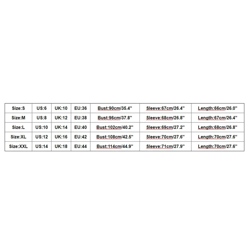 SizeUSUKEUBustSleeveLengthS6103690cm/35.4"67cm/26.4"66cm/26.0"M8123896cm/37.8"68cm/26.8"67cm/26.4"L101440102cm/40.2"69cm/27.2"68cm/26.8"XL121642108cm/42.5"70cm/27.6"70cm/27.6"XXL141844114cm/44.9"71cm/27.9"70cm/27.6"