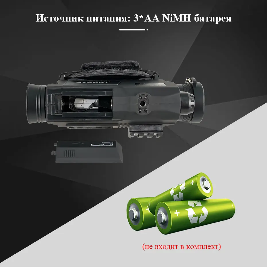 Монокуляр питается от NiMH-батареи 3 * AA, которую легко приобрести в местном магазине. А состояние батареи отображается на дисплее, так что легко заметить, когда батареи разряжаются. Батарейки не входят в пакет.