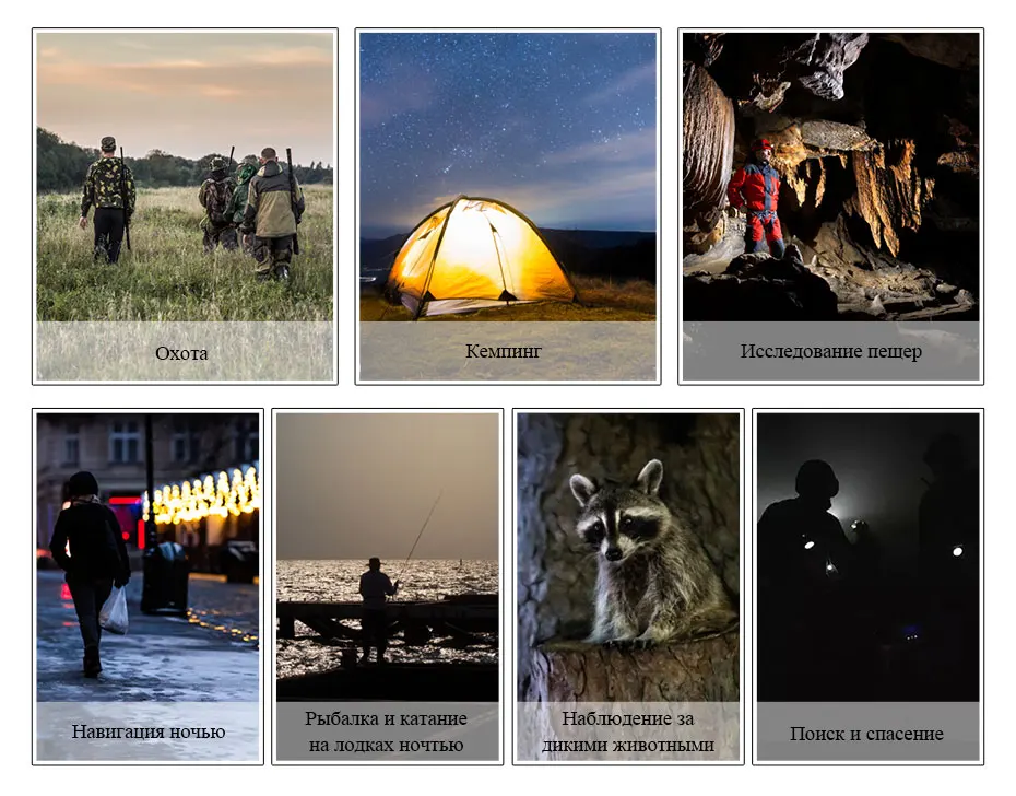 8. Применение: охота и скаутская игра/безопасность и наблюдение/Кемпинг развлечения/исследование пещер/Ночная Навигация/Ночная рыбалка и катание на лодках/наблюдение за дикой природой/поиск и спасение