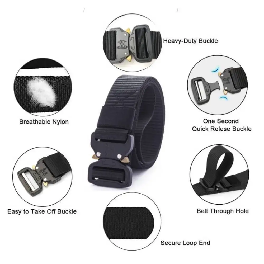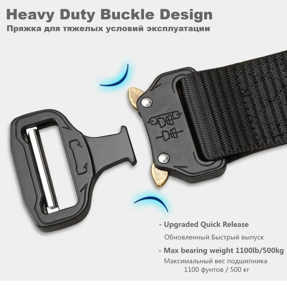Сверхмощный дизайн ремня: Этот универсальный ремень прикреплен военной пряжкой, изготовленной из сверхпрочного металла. Максимальный вес подшипника 1100lb/500kg. Сверхмощная пряжка-это самый безопасный в мире, наиболее тонко изготовленный и прочный Подшипник нагрузки, быстросъемные крепежи, широко используемые для военной подготовки или походов на природе.