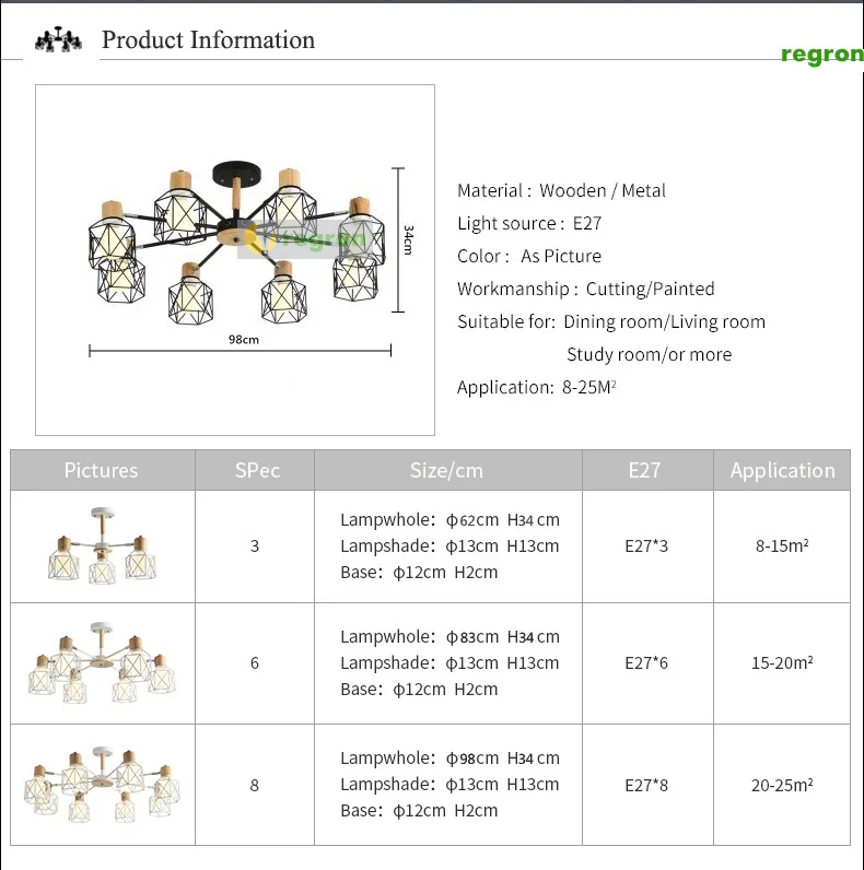 *Lightsource & bulb holder:E27 , 3/6/8 bulbs/lights*3-5W(led) or 7W(energy saving bulb) or 25W(Incandescent bulb), lightsource/bulbs not included