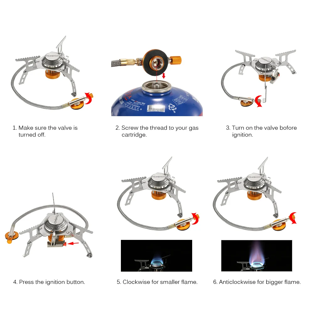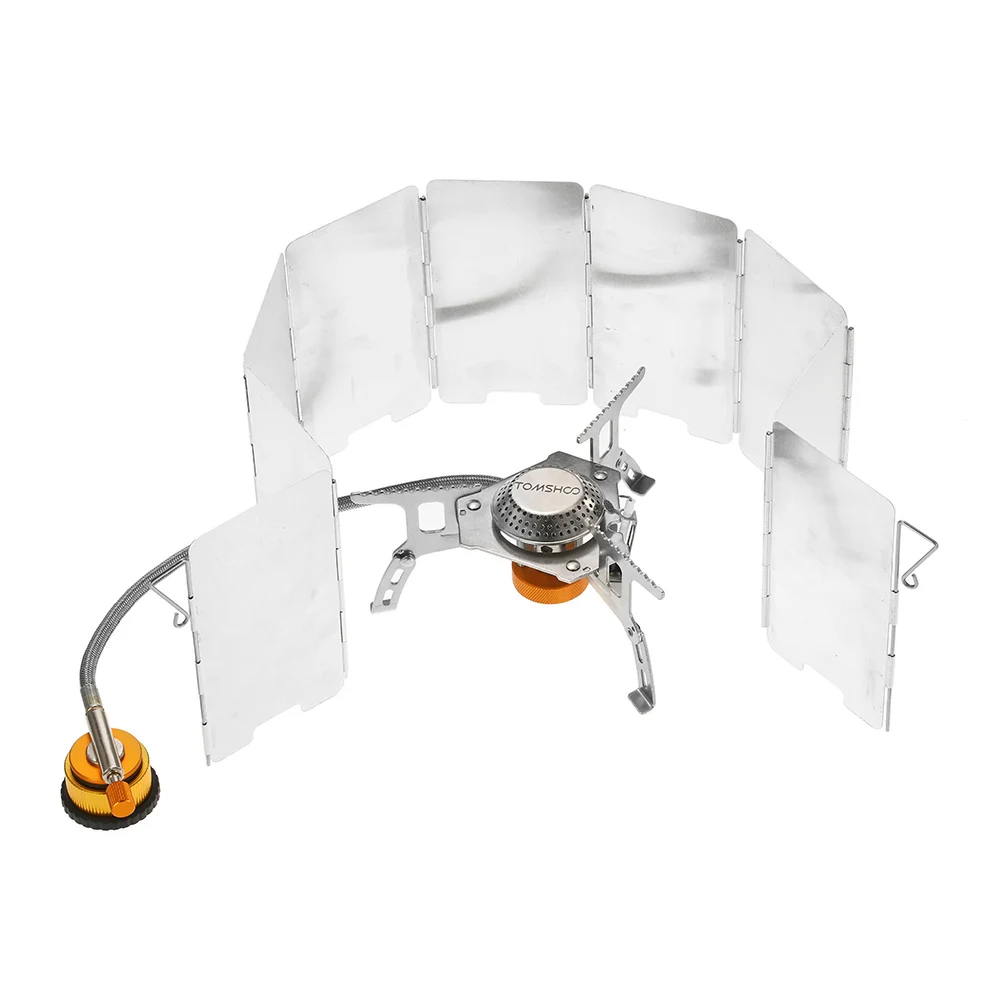 TOMSHOO camping stove includes a foldable gas stove, a 9-plate windshield and a gas cartridge converter. It is perfect for outdoor camping, hiking, backpacking, picnic, etc.
