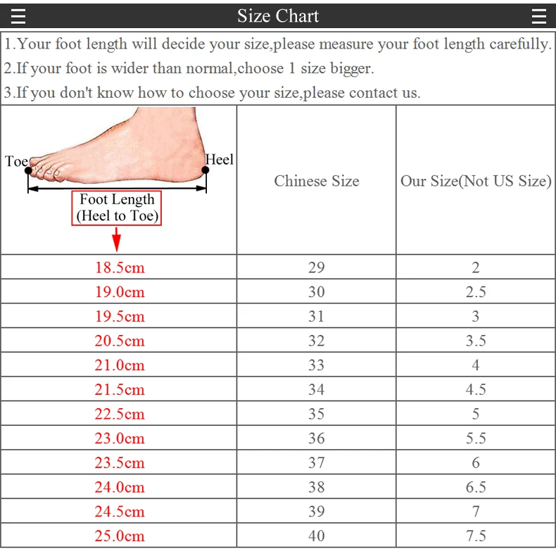 1. Измерение длины стопы является наиболее важным способом выбора правильного размера. Длина стопы не соответствует длине стельки. Длина стопы не соответствует длине подошвы. Длина стопы <длина стельки <длина подошвы 2. Новая обувь может иметь запах клея, пожалуйста, поймите. 3. Фото может быть ярким, но реальный продукт может быть немного темным, пожалуйста, поймите разницу. 4. Мы упаковываем обувь в пенополиэтиленовый пакет, что может сделать обувь немного мятой, пожалуйста, поймите. 5. Если вы считаете, что наше качество не очень хорошее, пожалуйста, обратитесь за помощью в нашу службу поддержки клиентов.
