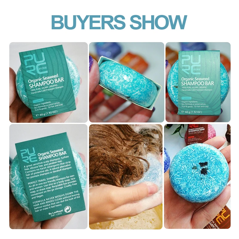 A great sensitive scalp shampoo. Sulfate free, silicone free, and paraben free. Contains no harsh detergents that strip hair of protective oils. A natural alternative for psoriasis shampoo or dandruff shampoo. PERFECT TRAVEL SHAMPOO An all in one eco friendly shampoo for men and women. Use also as a body soap, or shave soap. Recyclable box provides convenient on the go storage. Cruelty-Free and Vegan. FORMULA NEVER WEIGHS DOWN THE HAIR AND RINSES CLEAN without leaving behind residue that can dull the look of the hair or make it feel heavy Effect: PURC shampoo bar with different functions,can wash hand,Using wash hair or as a body soap, its pure & gentle for hair and scalp ,Pregant women and children can use Seven types smells: Cinnamon/ Seaweed/ Ginger /Mint/Jasmine/Lavender/Polygonum , Beautiful colorful packing, its a good choose as gift to your friends !