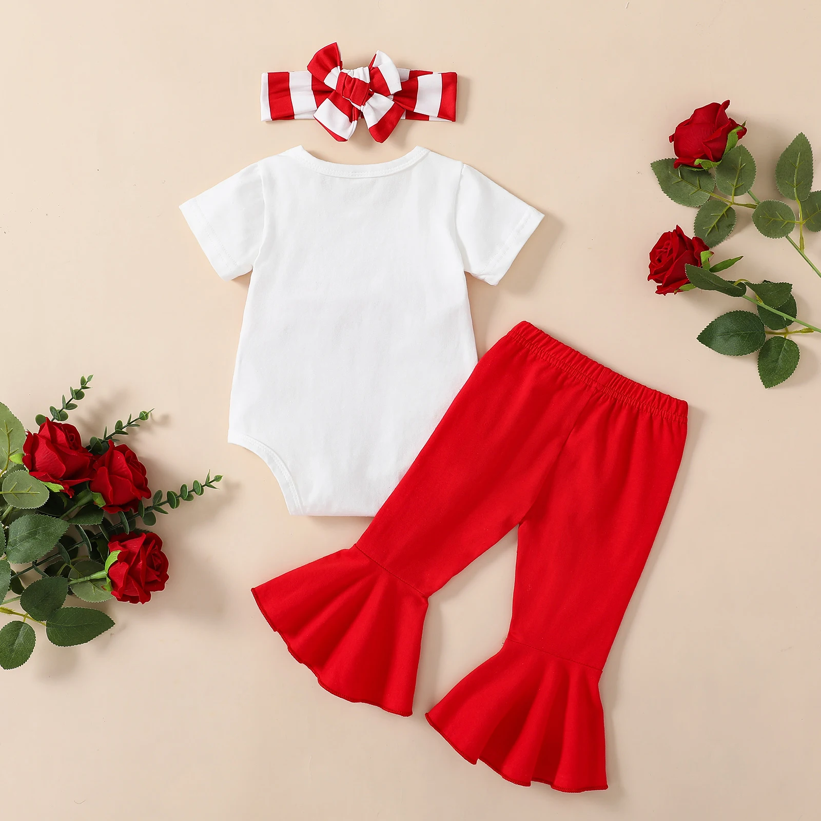 Комплекты одежды для маленьких девочек; Комбинезон в полоску с большим бантом и короткими рукавами и вырезом лодочкой; Однотонные расклешенные штаны; Повязка на голову; Комплект из 3 предметов