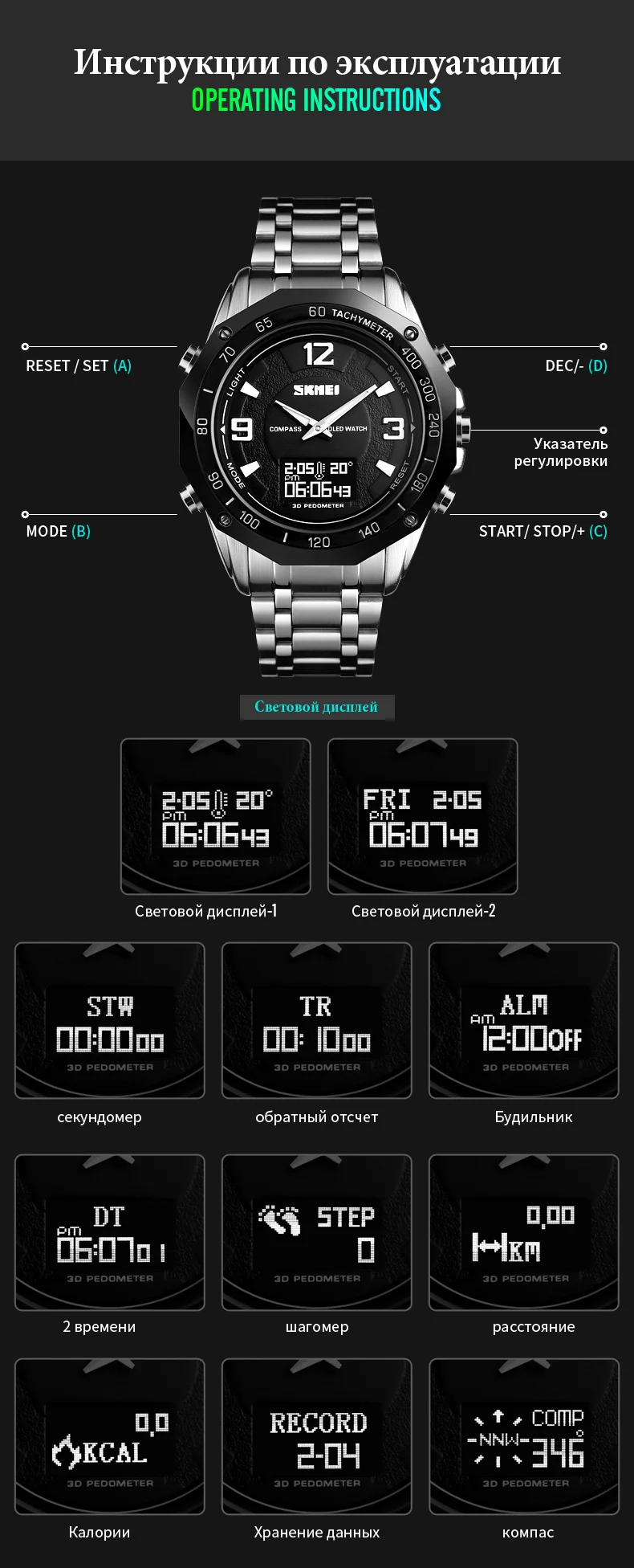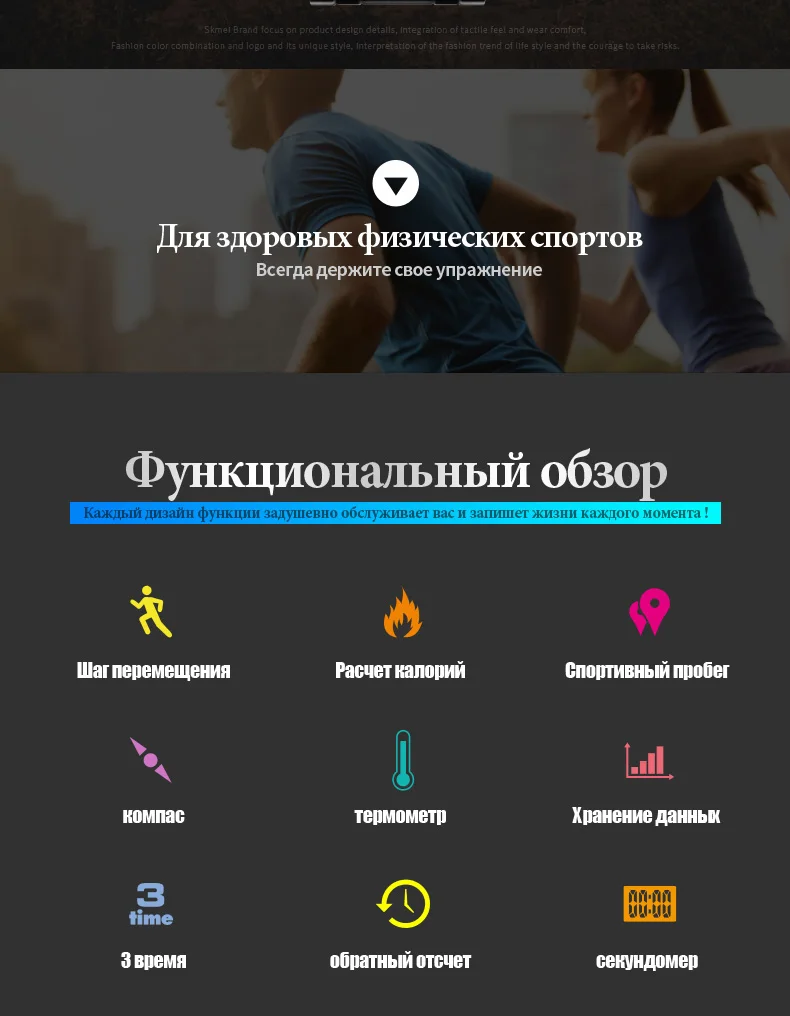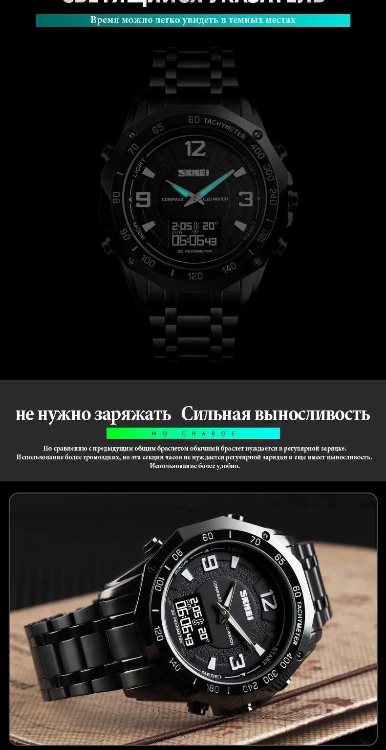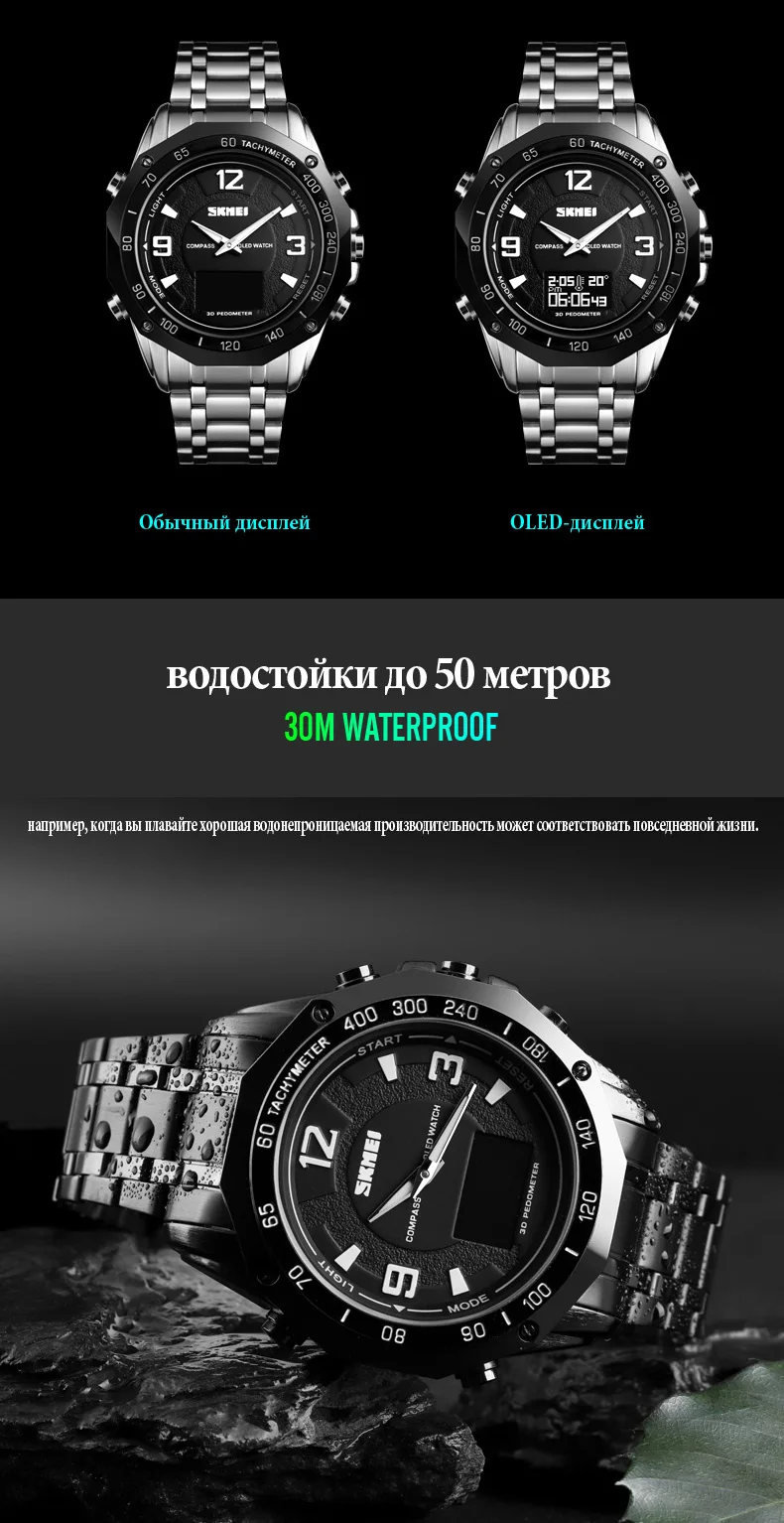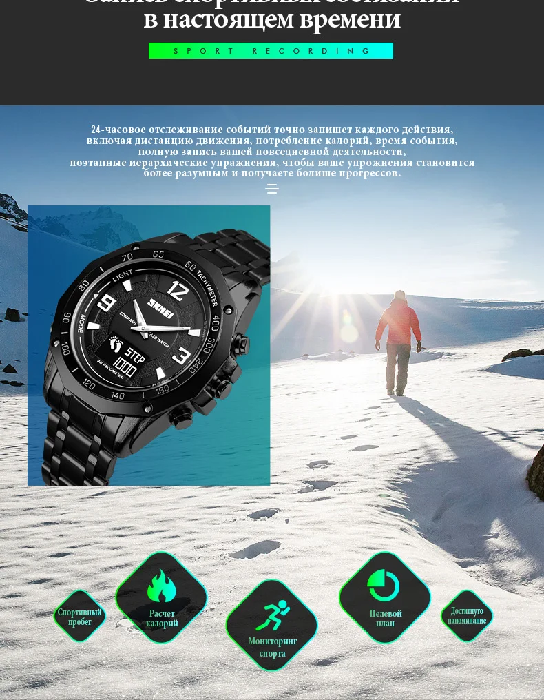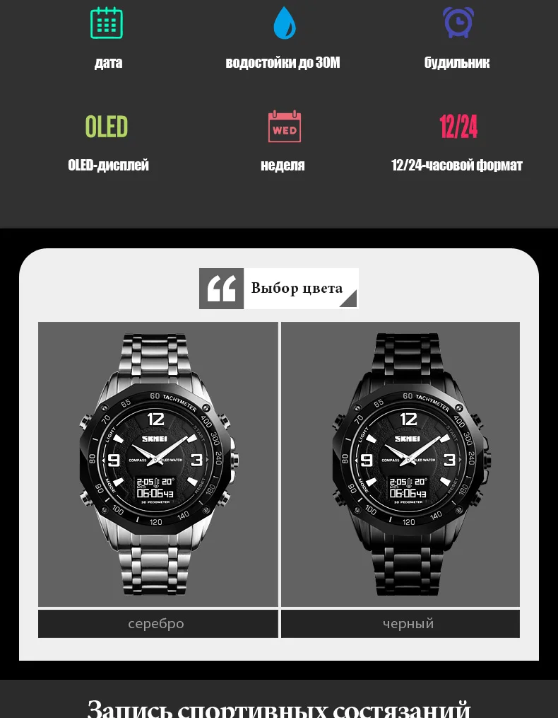 3 время, неделя, дата, компас, шагомер, калории, пробег, данные, секундомер, расстояние, секундомер, обратный отсчет, 50м водонепроницаемый, OLED дисплей, 12/24 часовые часы