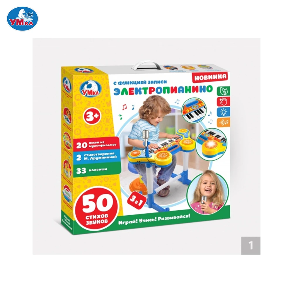 Электропианино на бат. свет+звук, 20 песен, стихи М.Дружининой, 7 тональностей, функция записи, с микрофоном, съемные стойки и стульчик в комплекте в русс. кор. ТМ"УМКА" в кор.6шт Электропианино "УМка" с функцией записи станет любимым музыкальным инструментом ребёнка. У него есть 3 функции: