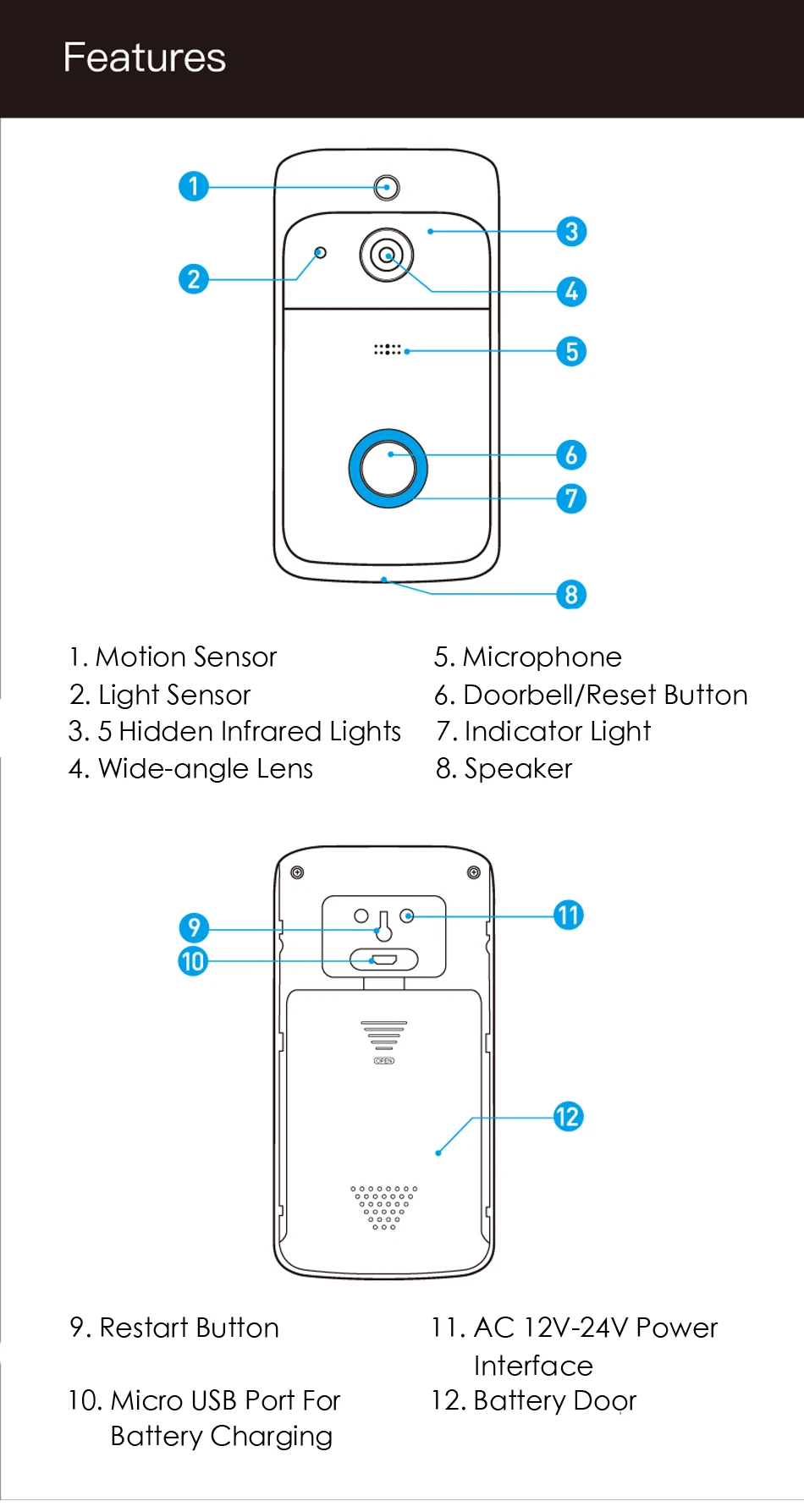 Устранение неполадок: В: мой сигнал плохой на моем дверном звонке? О: ваш дверной звонок может быть слишком далеко от вашего беспроводного маршрутизатора или у вас могут быть некоторые препятствия между тем, что снижает прочность сигнала. Вы можете попробовать перепозиционировать ваш маршрутизатор или получить расширитель сигнала/повторитель для вашего беспроводного маршрутизатора. В: Как мне сбросить дверной звонок? A: Нажмите и удерживайте кнопку RESET в течение 6 секунд. В: Как я могу поделиться видео-звонком с семьей? О: 1. Откройте приложение ToSee: С домашней страницы нажмите на дверной звонок в режиме реального времени. Нажмите на ldquoShare iconrdquo в правом верхнем углу. Введите пароль administrator устройства, затем нажмите ldquoconfirmrdquo. Taprdquo + rdquo. Введите новый прозвище userrsquos, затем нажмите ldquoConfirmrdquo. Вы увидите qr-код. 2. Откройте приложение ToSee на новом мобильном телефоне userrsquos. С домашней страницы taprdquo + rdquoin в правом верхнем углу. TaprdquoScan QR coderdquo, сканирование qr-кода, сгенерированного ранее. Вы увидите rdquosuccerrdquo, затем нажмите ldquoConfirmrdquo. Введите имя устройства. Коснитесь ldquoConfirmrdquoand yoursquore all set! В: как настроить чувствительность обнаружения движения PIR? О: 1. На странице списка устройств Нажмите на ldquoLive Viewrdquo. 2. Нажмите ldquoSettingsrdquoin в правом верхнем углу. 3.Tap ldquoMotion Detection Sensitivityrdquo Чувствительность обнаружения движения PIR Датчик движения PIR отключен 10-секундный Задержка запуска на ПИР обнаружения движения 5-секундного Задержка запуска на ПИР обнаружения движения Отсутствие задержки при обнаружении движения PIR В: Сколько пользователей может просматривать видео одновременно? О: до 4 пользователей могут просматривать видео канал, но только 1 пользователь может использовать прямой Интерком. Совместимость с iOS и Android. Вопрос: поддерживается ли WiFi 5 ГГц? Ответ: нет. Только 2,4 ГГц Wi-Fi поддерживается. В: я заказываю с батареей, почему я не могу включить камеру? О: Все батареи отправляются с изоляционной пленкой, вы должны вынуть его перед использованием. Вопрос: ночной режим на авто в ночное время? О: Да, он встроен в Фоточувствительный чип, ночной режим будет на авто ночью. В: мой дом-это вилла, я не хочу, чтобы дверной звонок с камерой вызывал меня всегда. Как я могу сделать? О: в настройках вы можете отключить Обнаружение PIR. Если вы не нажмете на кнопку дверного звонка, это не вызовет вас. В: иногда камера отключится в моем телефоне, как я могу сделать? О: передача wifi подключение к 4G или передача 4G к wifi. А затем перезагрузите приложение ToSee. Если проблема не может быть решена, затем перезагрузите дверной звонок. Вопрос: проверяется ли каждый дверной звонок перед отправкой? О: Да. Перед отправкой, все дверные звонки протестированы WiFi, качество видео, качество звука, соединение колокольчиков, обнаружение движения, ночной режим. ... И т. Д. В: Поддерживает ли дверной звонок Интерком? О: Да, он поддерживает 2CH Интерком. Независимо от того, где вы находитесь, люди возле двери могут говорить с вами, если ваш телефон имеет wifi или 4G сигнал. В: какую мощность он поддерживает? О: он поддерживает мощность 8 В ~ 24 В переменного тока. В: если питание аккумулятора истекает, как я могу сделать? О: вы можете использовать зарядное устройство с микро USB мощностью 5 В. Обслуживание клиентов Если товар неисправен, пожалуйста, сообщите нам в течение 3 дней с момента доставки, и все товары должны быть возвра