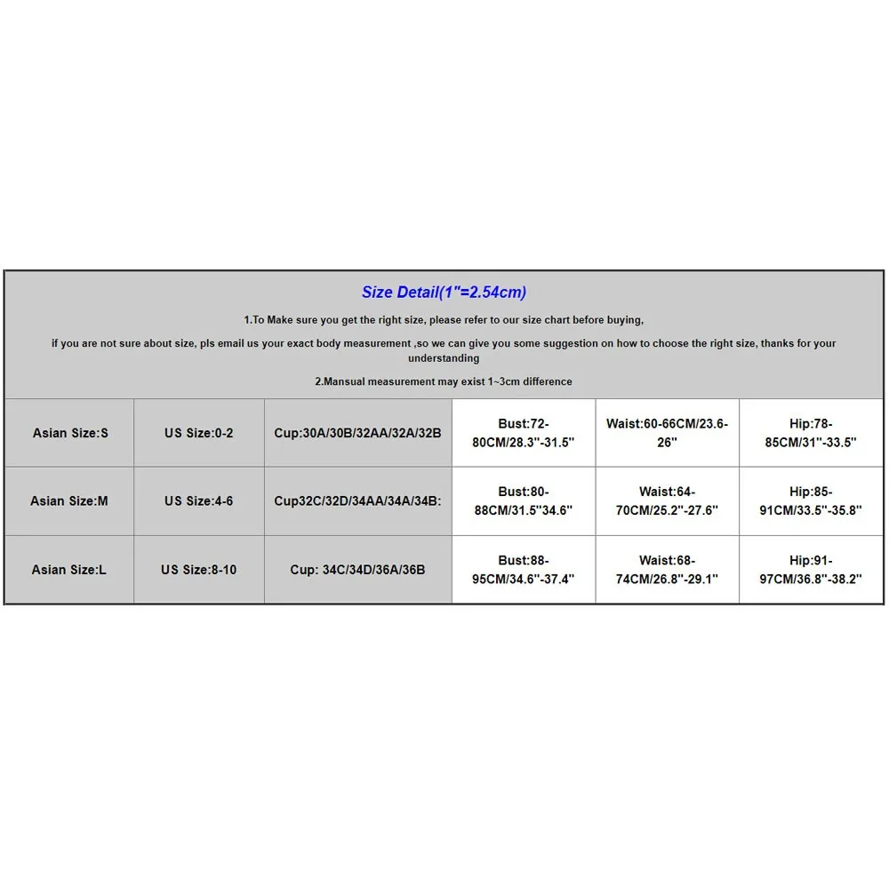 Asian Size:LUS Size:8-10Cup: 34C/34D/36A/36BBust:88-95CM/34.6"-37.4"Waist:68-74CM/26.8"-29.1"Hip:91-97CM/36.8"-38.2"