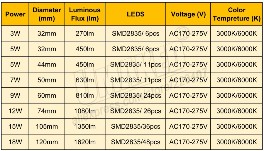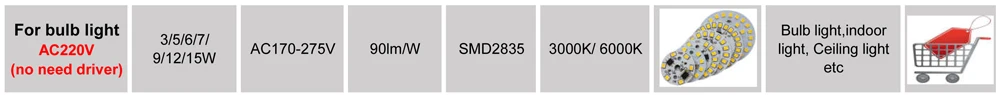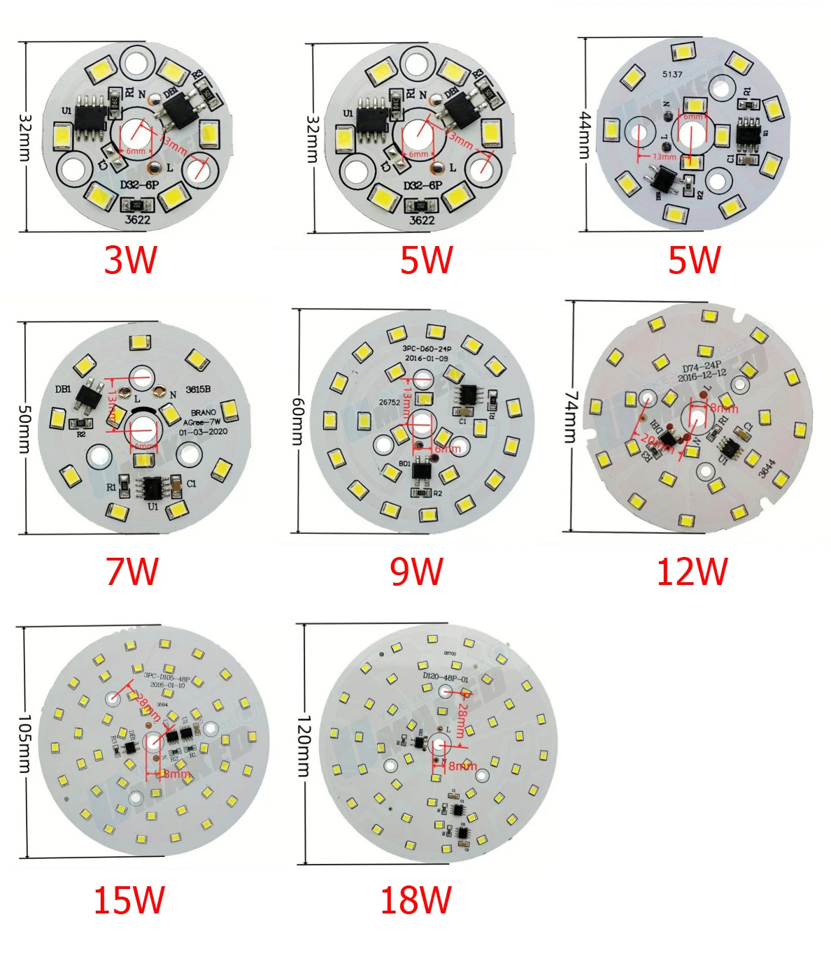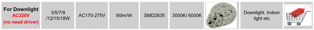 Feature1. Input AC170-275V,No need driver2. Use the 2835 epistar chip, Excellent quality and long life time3.Integrated IC technology without electrolytic capacitors and transformers longer life4.Products are small, allowing more flexibility and more creative lighting design5.High power factor(>80%) and low total harmonic distortion easily through the EMC certification6.Power conversion efficiency overall program high light efficiency(>90lm/w)7.Suitable for dimmer dimming TRIAC dimming some electronic transfer8.Suitable bulb, candle lamps, downlights, ceiling lightsDescriptionItem name: AC220V led downlight sourcePower: 3W 5W 7W 9W 12W 15W 18WVoltage: AC180-265VSize: 32mm/ 44mm/ 50mm/ 60mm/ 74mm/ 105mm/ 120mmLED chip: SMD2835Luminous Flux: 90lm per wattageCIR: Ra>0.7Power factor: >0.85Material: aluminum plate baseColor tempreture:Warm white: 3000-3500KPure white: 6000-6500KWarranty: 2 yearsCertificate: CCC CE and rohApplication: Widely used in bulb lighting, downlight, ceiling light, indoor lighting, special lighting, dinner lighting and so on.Packing included
