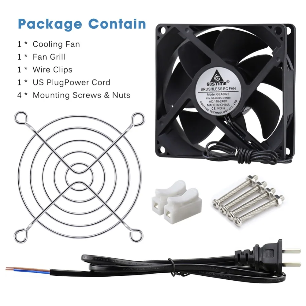 2x(1x 8025 Fan + 1x 8cm grill + 1x Wire Clips + 1x US Plug + 4x Screws)