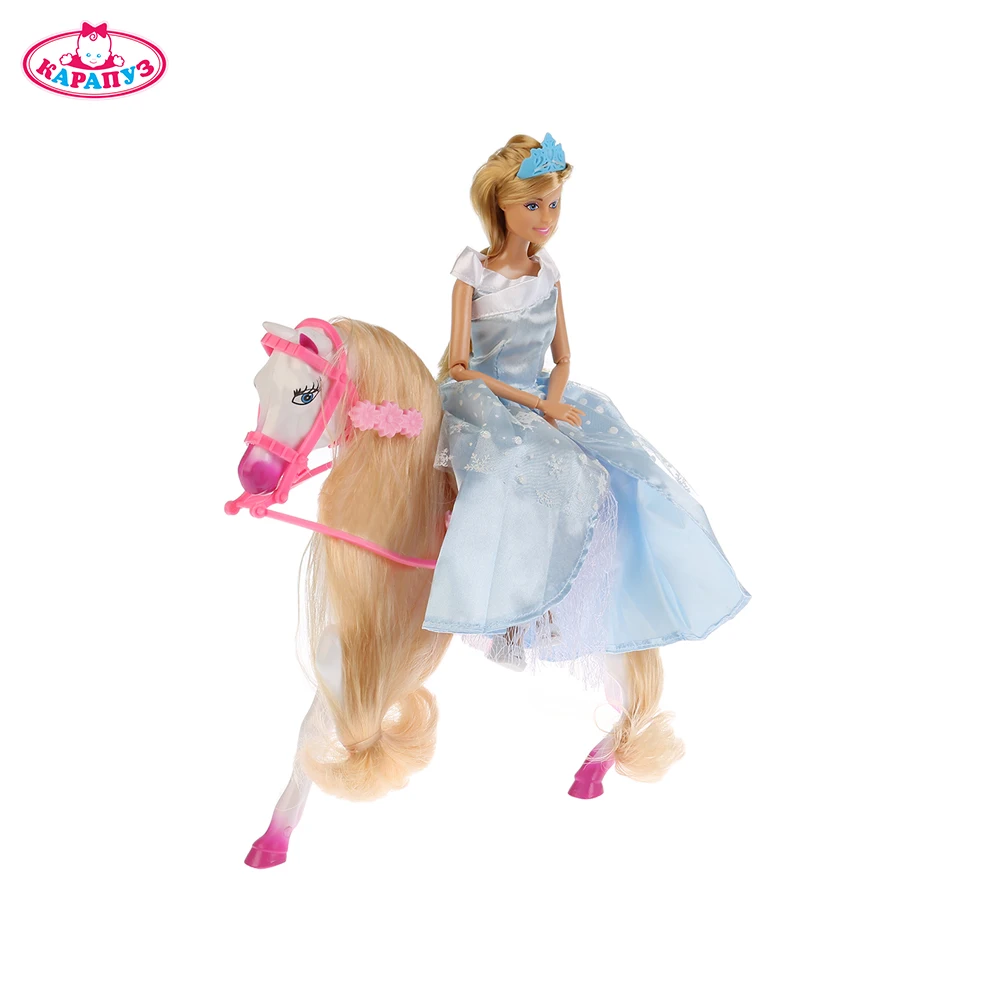 Снежная принцесса любит кататься на своей лошадке. У лошади длинная и шелковистая грива и хвост. Её можно причёсывать и заплетать.