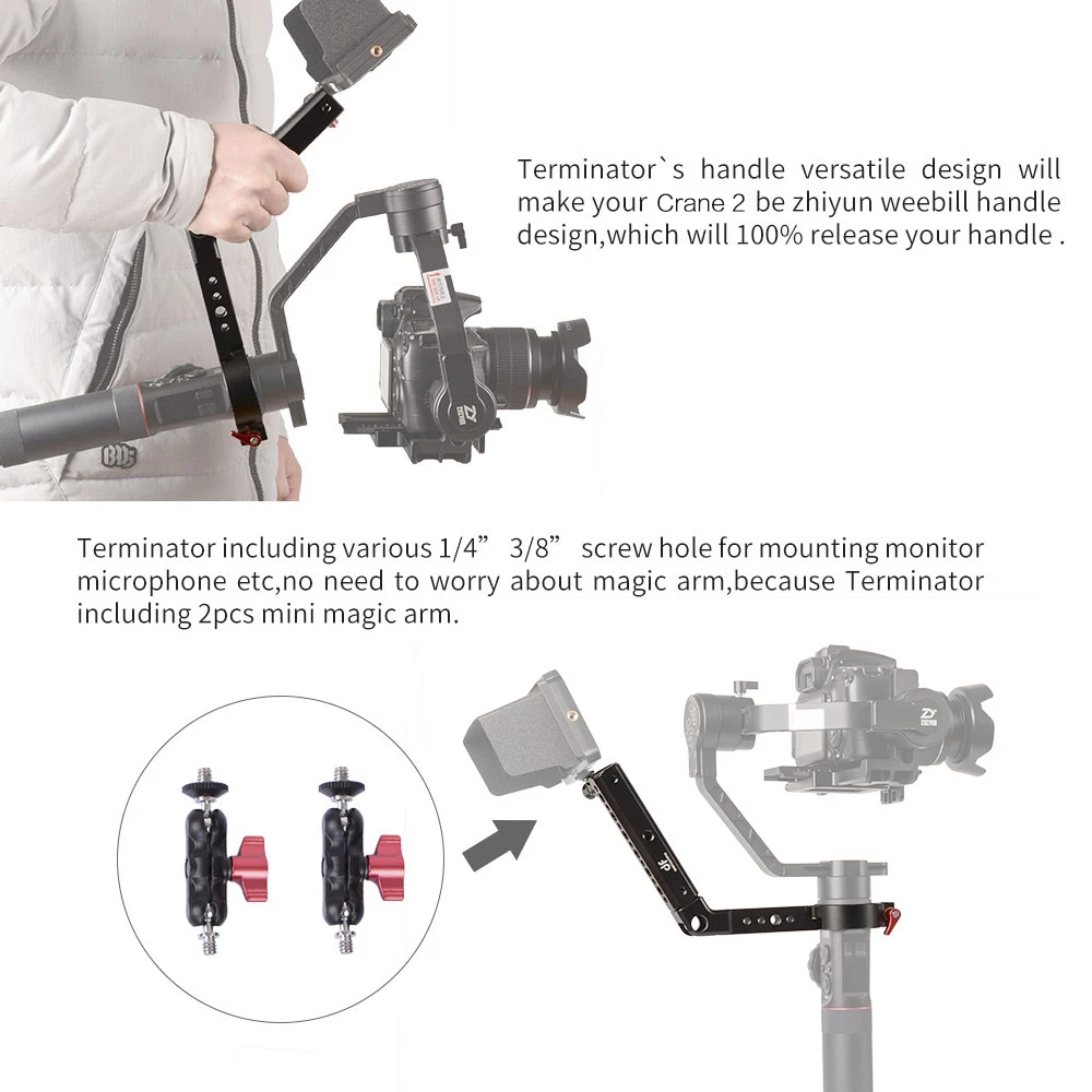 With Different 1/4 and 3/8 Inch Screw Hole: So you can mount different accessories for your Crane 2, such as microphone, monitor, etc. No need to worry about magic arm, because TERMINATOR including 2pcs mini magic arm.