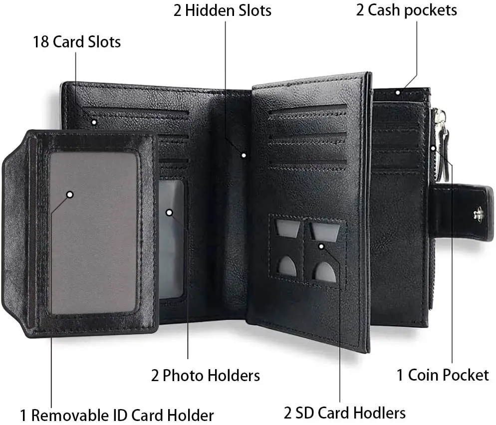 18 отделений для карт, 1 сумка на молнии, 2 кармана для наличных, 1 съемный держатель водительских прав, 1 место для фотографий. Классификация денег и карт, легко положить и вынуть