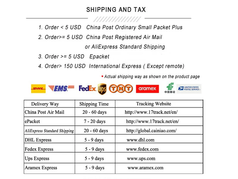 1.Способ доставки: Бесплатная доставка, заказ будет отправлен Почта Китая Ordinary Small Packet Plus). Но если объем заказа будет больше 200 долларов США, мы отправим DHL Или EMS Бесплатно, Доставка в течение 3-12 дней;