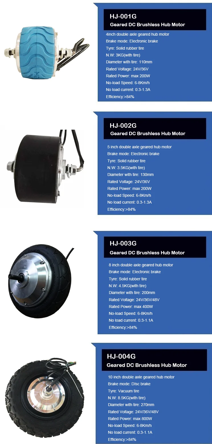 Напряжение: 24 В/36 В/48 В постоянного тока Мощность: макс. 250 Вт Скорость: Макс 6-8 км/ч Диаметр с шиной: 125 мм Тормоза: EBS тормоза Шины: шестерённый насос Вес: 3,5 кг с шин Размеры: 5 дюймов Датчик: с датчиком Холла
