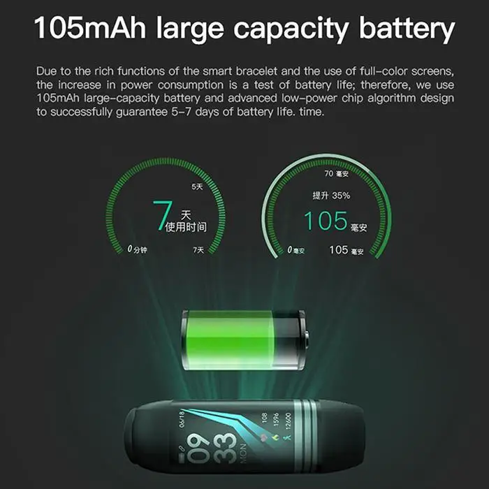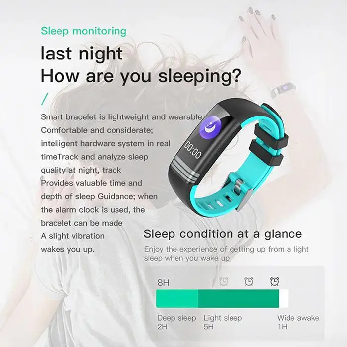 Color: Yellow, Red, Purple, Gray, Green, Blue green, Blue, Black Appearance material: PC Wrist strap material: TPU, silicone Waterproof rating: IP67 Charging time: 2h Life time: 7d Product language: Multi Chip: DA14585 Compatible system: Android4.4 or above, IOS8.2 or above Flash memory: 128K+16M Screen type: TFT color screen Screen size: 0.96 Resolution: 160 x 80 Touch screen type: single touch Connection parameters: Bluetooth BT4.0 Battery :Battery type Polymer lithium battery Type: Smart Bracelet Quantity: 1Pc Capacity: 105mAh APP Software Features: Exercise, calorie, distance, stopwatch, multi-sports mode (running, cycling, climbing, walking). Health, blood pressure, heart rate, blood oxygen, sedentary reminder, sleep monitoring, automatic heart rate monitoring, etc. Social sharing, WeChat, QQ, LINE, Facebook, Twitter, KaoKao Talk, WhatsApp, Skype, etc. Bright screen, call reminder, SMS reminder, alarm reminder, shake a photo, mobile phone search, etc. Package Content: 1 x Smart Bracelet Note: Due to the difference between different monitors, the picture may not reflect the actual color of the item.1cm=0.3937inch