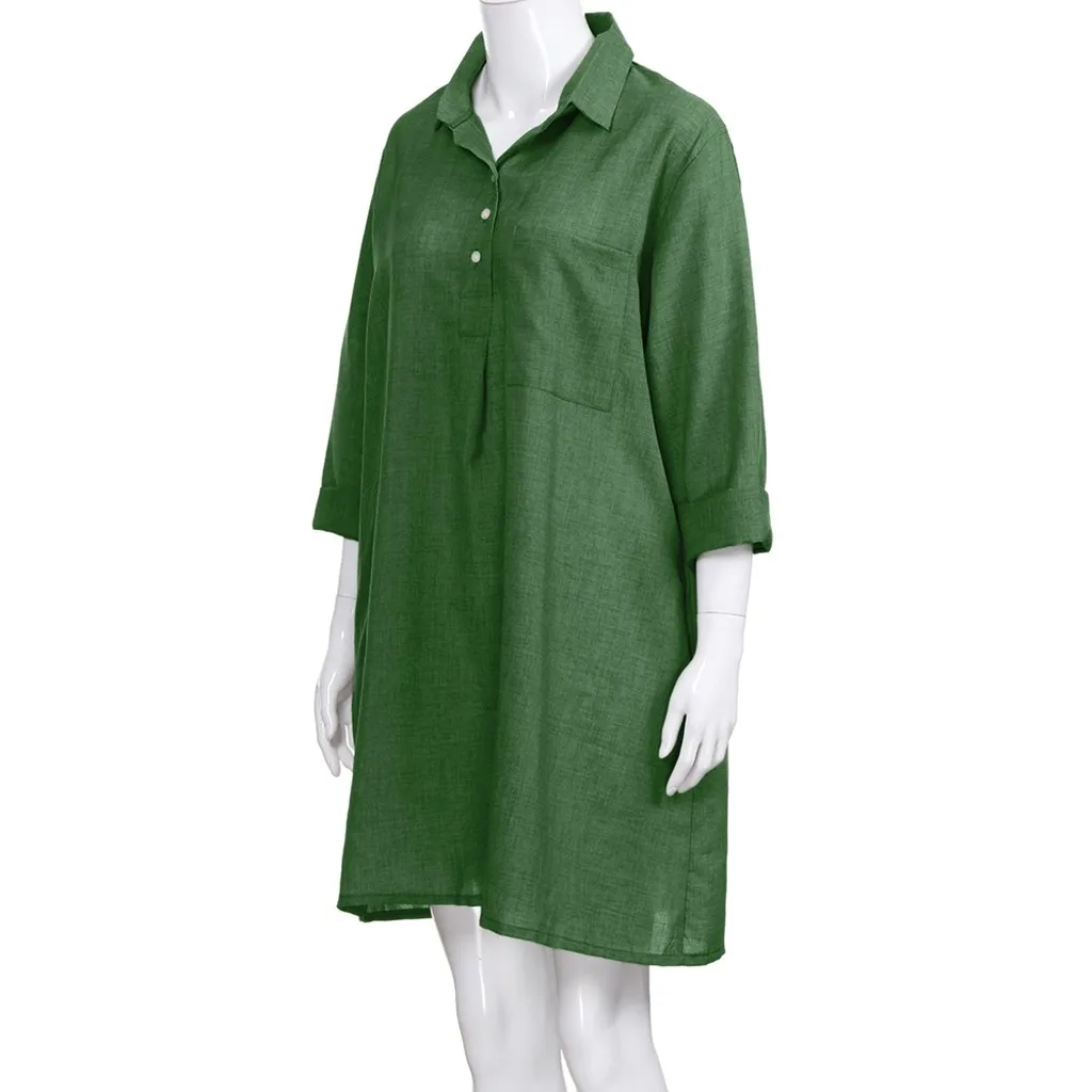 Женское платье в стиле бохо с отложным воротником, рукав 3/4, Повседневное платье с карманами и пуговицами