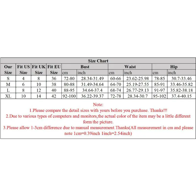 Материал: полиэстер цвет: черный, белый Размер: S/M/L/XL (китайский размер, следуйте таблице размеров, чтобы выбрать, пожалуйста) Размер: S(US4/UK8/EU36) обхват груди: 72 см-80 см (28,34 дюйма-31,49 дюйма) обхват талии: 60 см-66 см (23,62 дюйма-25,98 дюйма) обхват бедер: 78-85 см (30,7-33,46 дюйма) Размер: M(US6/UK10/EU38) обхват груди: 80-88 см (31,49-34,64 дюйма) обхват талии: 64 см-70 см (25,19 дюйма-27,55 дюйма) обхват бедер: 85 см-91 см (33,46 дюйма-35,82 дюйма) Размер: L(US8/UK12/EU40) обхват груди: 88-95 см (34,64-37,4 дюйма) Талия: 68-74 см (26,77-29,13 дюйма) бедра: 91-97 см (35,82-38,18 дюйма) размер: XL(US10/UK14/EU42) обхват груди: 92-100 см (36,22-39,37 дюйма) обхват талии: 72-78 см (28,34-30,7 дюйма) обхват бедер: 95 см-102 см (37,4 дюйма-40,15 дюйма) Количество: 1 шт.
