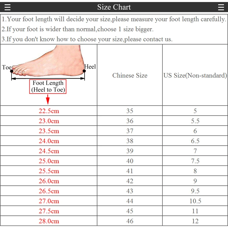 1. Длина стопы очень важна для выбора правильного размера, см. Фото ниже. Длина стопы-это не длина стельки. Длина стопы-это не длина подошвы. Длина стопы <длина стельки <длина подошвы 2. Фото может быть ярким, реальный продукт может быть тусклым, пожалуйста, отнеситесь с пониманием к разнице. 3. Мы упаковываем обувь в Поролоновый пакет, чтобы обувь была слегка помята, надеемся на понимание. 4. Новая обувь будет иметь запах клея, пожалуйста, надеемся на понимание. 5. Авиа-отправление Почты Китая является медленная, пожалуйста, подождите терпеливо. 6. Если вы считаете, что наше качество плохое, обратитесь в нашу службу поддержки клиентов.