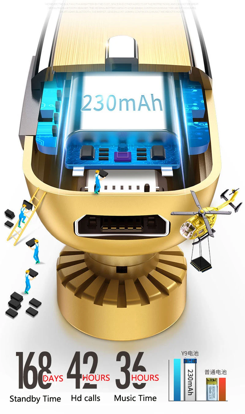 Особенности: Высокая емкость, долгое время работы и энергосбережение. Супер тонкий и крошечный, очень удобный для использования. Поддержка HFP, HSP и A2DP. Поддержка CVC denoise, чистый и hi-fi звук. Совместим с большинством мобильных телефонов и планшетов, которые поддерживают функцию Bluetooth. С дисплеем емкости на устройстве iOS. Встроенный микрофон, так что вы можете легко принимать звонки. Обеспечьте вам сдержанное и более комфортное прослушивание без проводов. Технология Bluetooth позволяет подключаться к любому интеллектуальному устройству. Технические характеристики: Название модели: Bluetooth наушники Y9 Цвет: черный/белый/золотой/розовое золото Тип: стерео bluetooth-гарнитура Кнопки управления: воспроизведение/пауза/вызов/прием Время работы в режиме разговора: 20 часов Время в режиме ожидания: 60 дней Время прослушивания музыки: около 15-18 часов Поддержка формата: MP3,MP4, WMA WAV Система поддержки: IOS / Android /Window Micro USB в Встроенная литиевая батарея (заряжается через USB) Встроенный микрофон для использования в громкой связи Материал: пластик и Резина Размер: 60*20*17,5 мм Посылка включает в себя: 1 * Bluetooth гарнитура 1 * USB кабель 1 * ушной крючок 1 * уши чашки 1 * Руководство пользователя