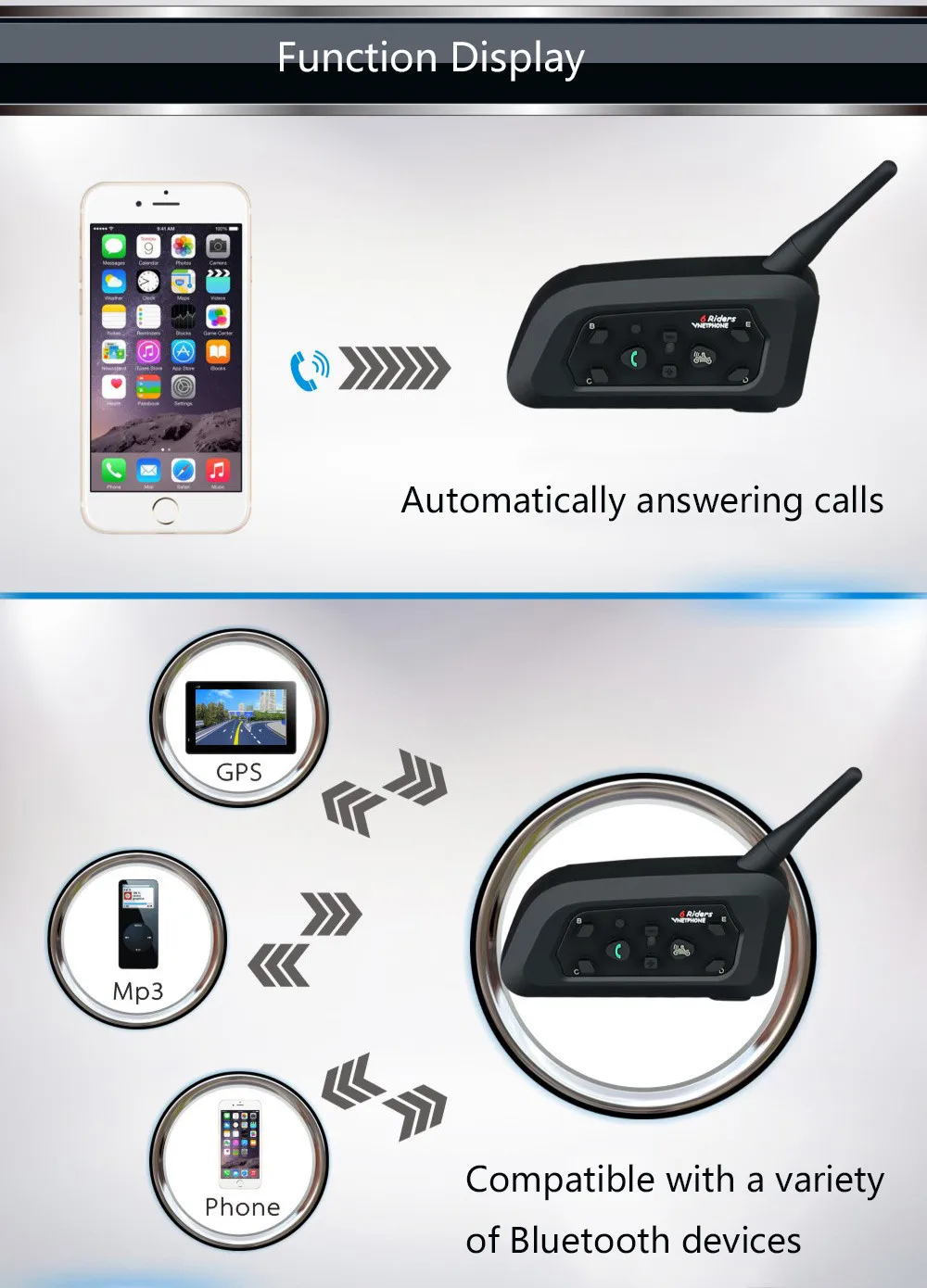 Этот V6 Шлем Интерком предназначен для мотоциклиста и пассажира, которые желают иметь четкую и надежную беспроводную связь во время езды. Эта гарнитура совместима с сотовыми телефонами Bluetooth, GPS, mp3 и может быть подходит для любого типа шлема для мотоциклистов.