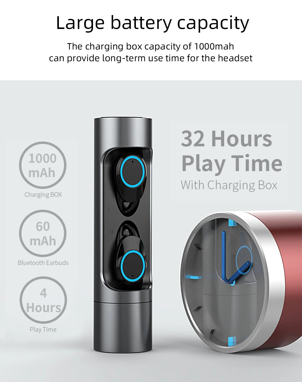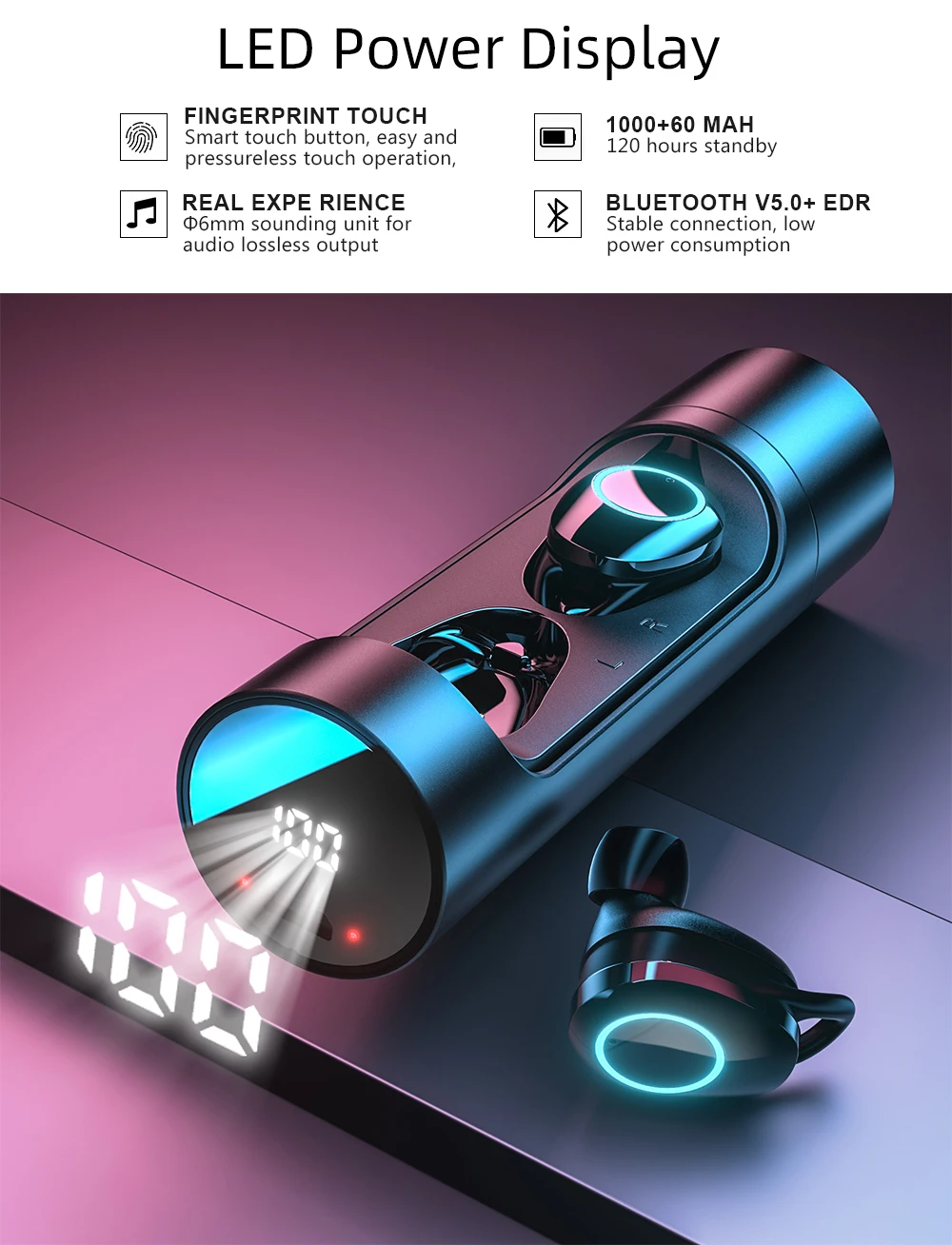 Продукт Особенности: Версия Bluetooth: 5,0 Дальность передачи: 20-30 метров Рабочая частота: 2,4 ГГц-2,48 ГГц Зарядным устройством Емкость батареи: 1000 мАч Наушников Емкость аккумулятора: 60 мА/ч, литий-полимерный аккумулятор Продолжительность звонка: около 4 часов Прослушивание песня: около 4 часов Водонепроницаемый уровень: IPX6 Время работы в режиме ожидания: 120 часов Наушники Время зарядки: около 50 минут Зарядным устройством Время зарядки: около 1,5 часов Кнопка: сенсорная кнопка Основные черты: 1: металлический корпус, уникальной текстурой 2: интеллигентая (ый) “дышащими” световыми индикаторами (управляемый коммутатор); Классная модная модель 3: эта кнопка регулировки громкости сложение и вычитание 4: IPX6 из водонепроницаемого материала 5: вызов, чтобы слушать песни в течение 4 часов, длительное время работы от аккумулятора 6: бинауральный вызова по произвольному выбору левые и правые ответ 7: пройденное расстояние передачи работает стабильно и дальность передачи составляет 20-30 метров. 8:1000 мА/ч, большая емкость, может быть аварийный фонарик. 9: автоматическое переключение автоматически и автоматически подключится, он очень удобно Упаковочный лист: 2 x по-настоящему Беспроводной наушники 1 x Micro Зарядка через USB кабель 1 x зарядный чехол Руководство пользователя (1 шт.)