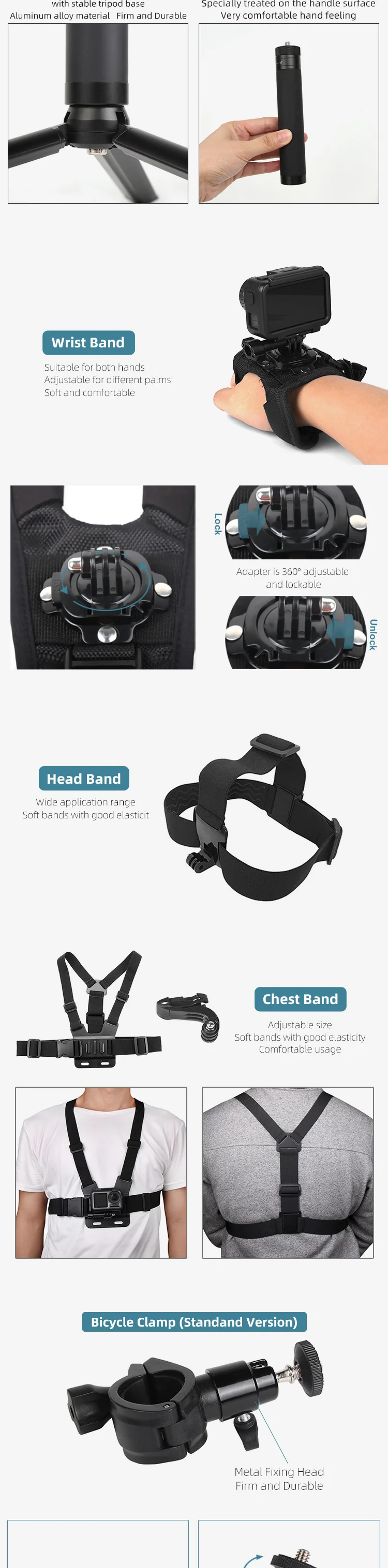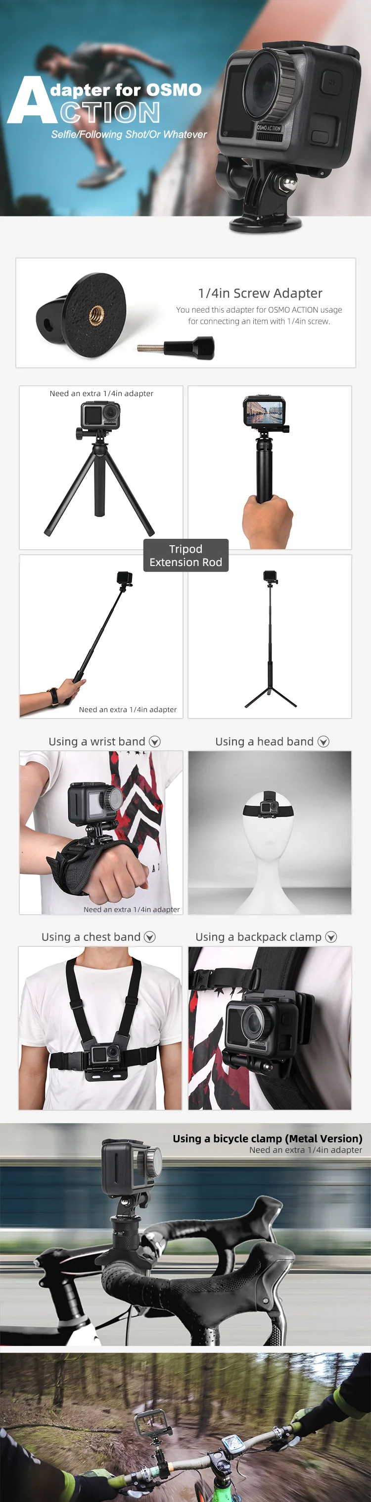 Различные адаптеры для различных ситуаций с рамкой камеры, OSMO ACTION может подключить зажим для рюкзака, головную повязку, нагрудную повязку, запястье, ремешок на запястье, шейный ремешок; адаптер 1/4in используется только для деталей с винтом 1/4in. С адаптером 1/4in OSMO ACTION может подключать штатив, Удлинительный стержень, велосипедные зажимы, крепление на присоске в автомобиле, держатель камеры на mavic 2.