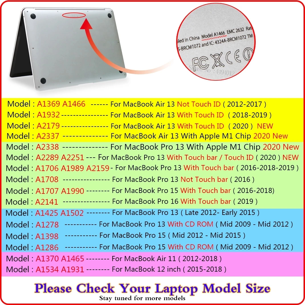 -Для Macbook Air 11 ----- Модель: A1370 / A1465 ----- (2012 - 2018)-Для Macbook 12 дюймов ----- Модель: 1534 / A1931 ----- (2015-2018)-Для Macbook old Air 13 дюймов (не сенсорный ID ) ----- Модель: A1466 / A1369 ---- (2012 - 2017)-Для Macbook Touch ID Air 13 дюймов ----- Модель: A1932 ---- (2018-2019)-Для Macbook Touch ID New Air 13 дюймов ----- Модель: A2179 ---- (2020)-Для Macbook Pro 13 с Retina ------ Модель: A1425 / A1502 ---- (конец 2012-Early2015)-Для Macbook Pro 13 с CD ROM ----- Модель: A1278 ---- (Mid 2009 - Mid 2012)-Для Macbook Pro 13 с сенсорной панелью ----- Модель: A1706 / A1989 / A2159 ---- (2016 - 2019)-Для Macbook Pro 13 с сенсорной панелью ID ----- Модель: A2289 / A2251 ---- (2020) Новинка-Для Macbook Pro 13 Not Touch Bar ----- Модель: A1708 ---- (2016 - 2018)-Для Macbook Pro 15 с Retina ------ Модель: A1398 ---- (Mid 2012 - Mid 2015)-Для Macbook Pro 15 с сенсорной панелью ----- Модель: A1707 A1990 ----- (2016 - 2018)-Для Macbook Pro 15 с CD ROM ----- Модель: A1286 ----- (Mid 2009 - Mid 2012)-Для Macbook Touch ID Pro 16 с сенсорной панелью ----- Модель: A2141 ----- (2019)![]()