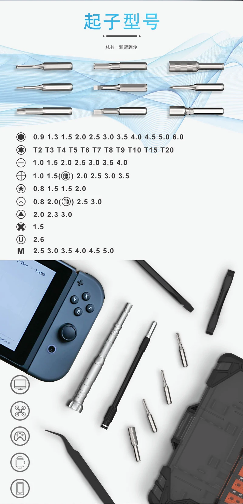 Особенности: Компактный и легкий Удобно носить с собой, меньше места и широкое использование Уникальный способ открыть и прочный материал. Можно использовать различные аксессуары. Набор прецизионных отверток 62 в 1 S2 материал и обработка поверхности Упаковка: Набор прецизионных отверток-1 шт.