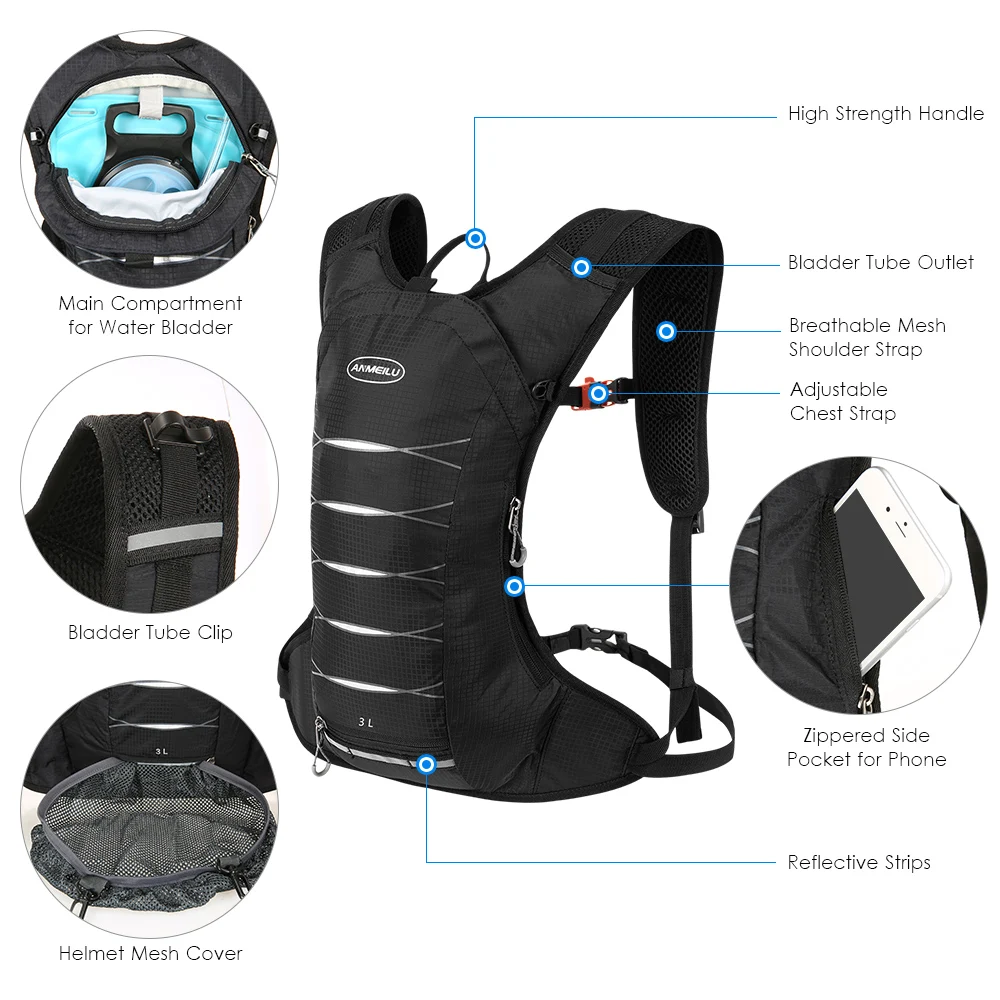 Изготовленный из высококачественной нейлоновой ткани, этот рюкзак является водоотталкивающим и устойчивым к разрывам. Он имеет основное отделение для водяного пузыря 3 л, а боковой карман на молнии для вашего телефона. Эргономичная сетчатая спинка и лямки обеспечивают вам максимальный комфорт во время езды на велосипеде. Его легкий вес делает этот рюкзак идеальным выбором для любых видов активного отдыха, таких как Велоспорт, бег, кемпинг, туризм, треккинг.