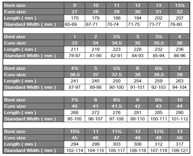 Таблица размеров Bont