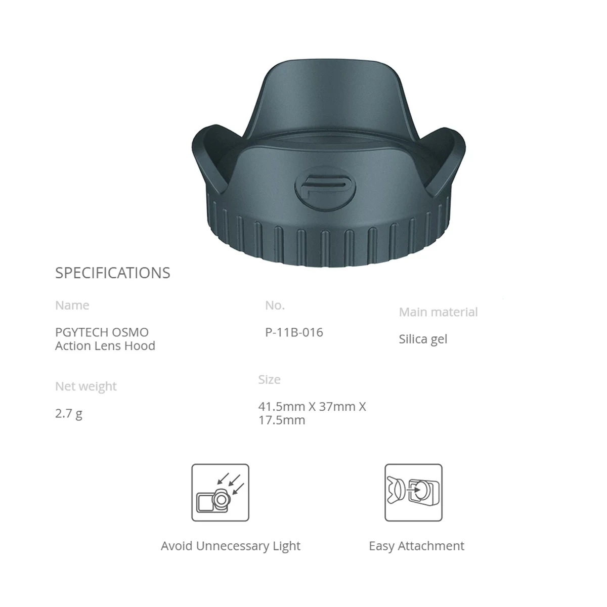 PGYTECH OSMO экшн-бленда эффективно защищает объектив от рассеянного солнечного света, не блокируя поле зрения. Особенности мягкой резины, которая обеспечивает комфорт для рук Обработанные матовой поверхностью, черные материалы значительно уменьшают отражение в линзе. Мягкие материалы облегчают крепление и не допускают повреждений. Характеристики: Название продукта: PGYTECH OSMO экшн бленда объектива № P-11B-016 Основной материал: силикагель-100% Примечание: Перед использованием внимательно прочитайте руководство по эксплуатации. Комплектация: PGYTECH OSMO экшн-объектив Hood× 1 Руководство пользователя × 1