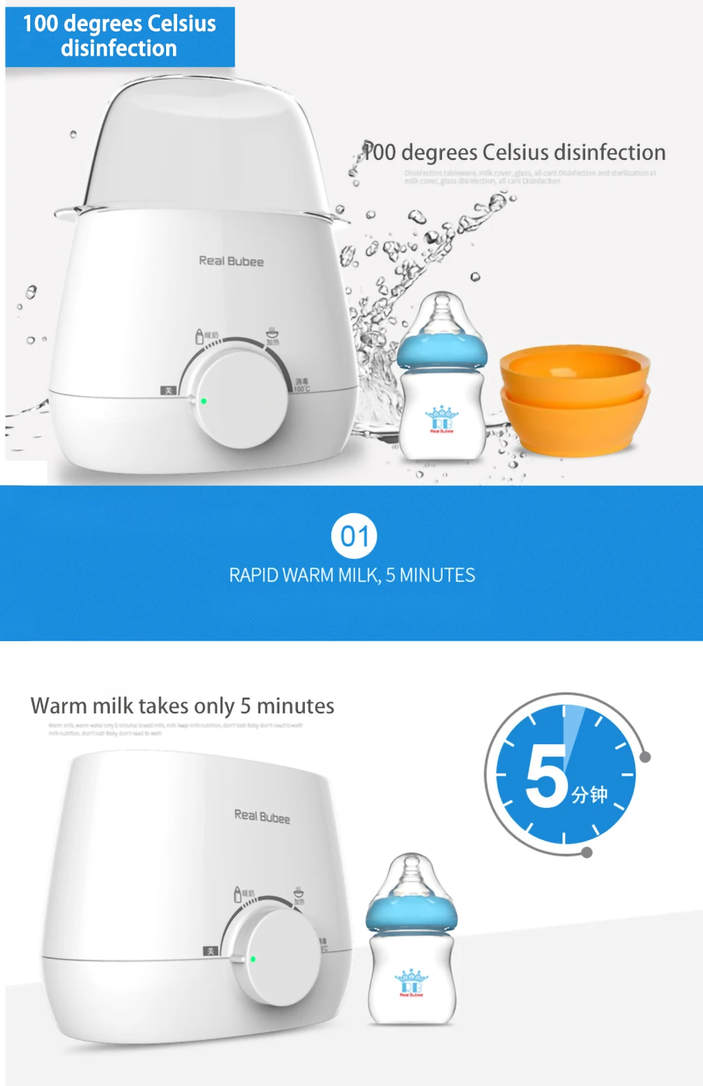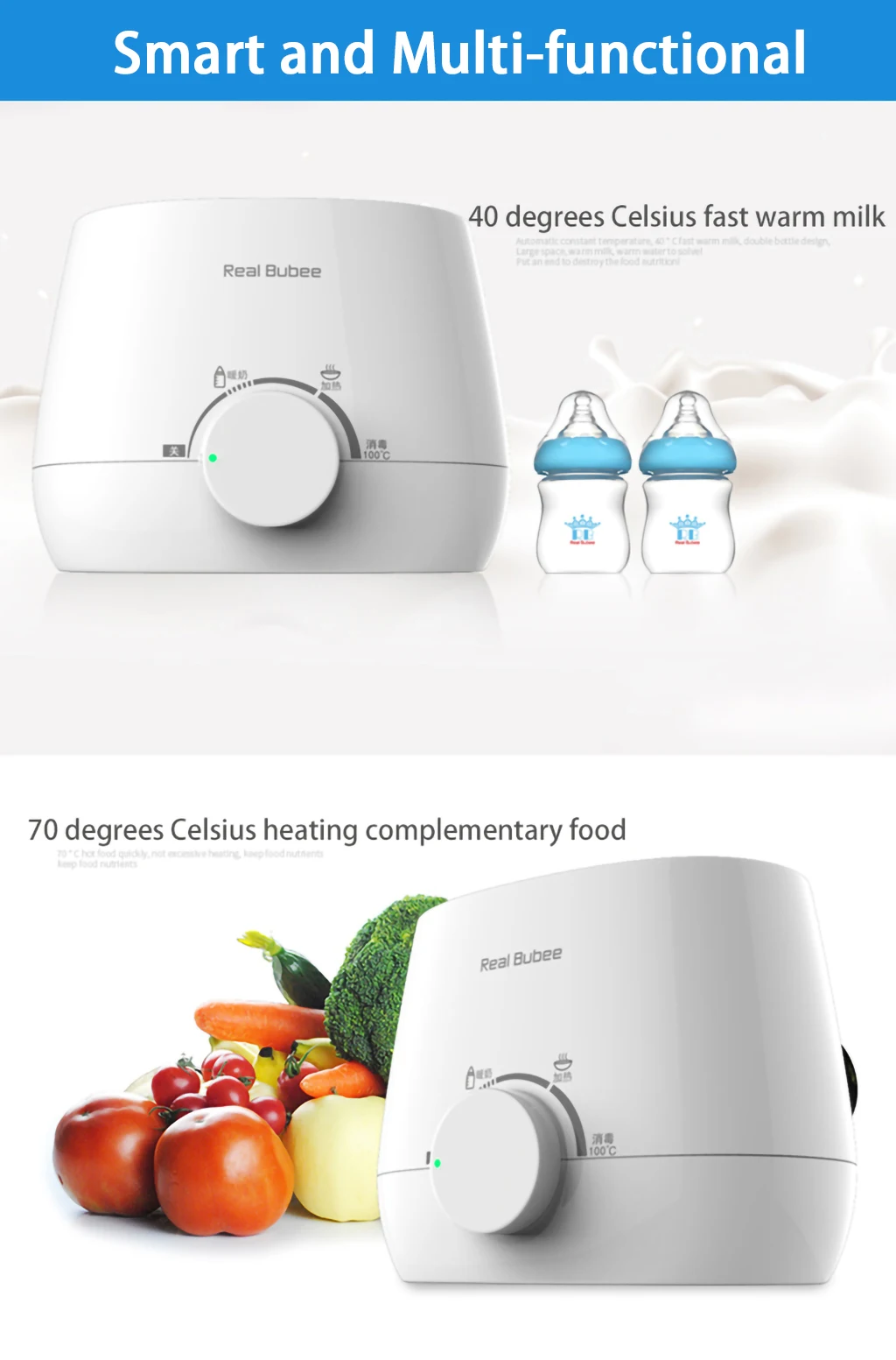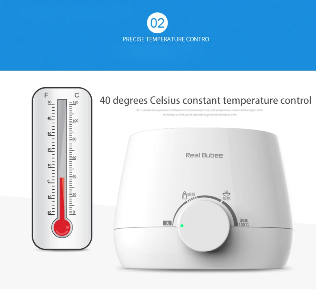 Характеристики продукта: простая работа, точная постоянная температура, теплое молоко и вода, нагревание дополнительной пищи, стерилизация при температуре 100 градусов Цельсия
