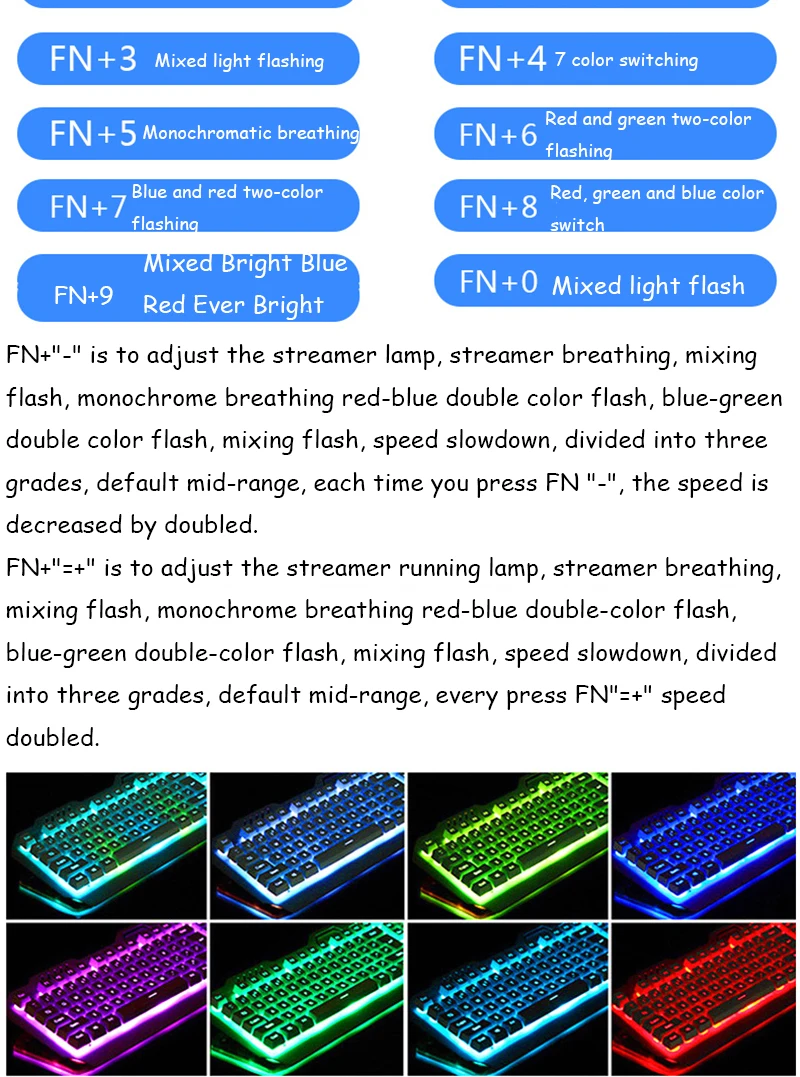 Параметры продукта: Игровой контроллер IC Удобная клавиатура Лазерная гравировка символов Водонепроницаемый Тип интерфейса: USB Количество ключей: 104 ключа Измерение: 425*1125*25 мм Длина кабеля: 1800 мм Вес: 1038 г Срок службы ключей: 10 миллионов раз Напряжение: 5 В/постоянный ток +-0,5 В Ток: 200 мА Тип интерфейса: Usb Эргономика: Поддержка Информация о продукте: Ретро дизайн с круглым колпачком, Высококачественная передняя панель с красивой изгибом. Время отклика каждого нажатия составляет всего 2 мс, невероятная долговечность 50 миллионов нажатий клавиш на ключ. Регулируемый режим подсветки: вы можете настроить подсветку. Клавиатура со светодиодной подсветкой создает лучшую атмосферу игр и ввода текста. Эргономичный дизайн: подвеска, вогнутый колпачок, идеально подходит для точного позиционирования, предотвращает усталость и неправильный ввод текста. Широкая совместимость: Plug & play, драйверы или программное обеспечение не требуются. Поддержка компьютерной системы, включая Windows 10, Windows 8, Windows 7, Mac OS X, Windows XP, Windows VISTA, MAC и т. д. Функциональная клавиша FN F1 = музыка FN F2 = громкость- FN F3 = Громкость + FN F4 = Mute FN F5 = стоп FN F6 = предыдущий FN F7 = Play FN F8 = следующий FN F9 = почтовый ящик FN F10 = домашняя страница в Интернете FN F111 = полноэкранный переключатель FN F12 = калькулятор Управление Подсветкой: Нажмите FN Блокировка прокрутки = функция подсветки выключения цвета Управление дыханием: функция FN HOME FN «=» и FN «_-» регулировали скорость подсветки, чтобы дышать скоростью, по умолчанию средняя скорость, деленная на три класса, нажмите на подсветку, чтобы увеличить скорость дыхания и, наоборот, FN «_-» Светодиодная подсветка: FN PGDN: уменьшает яркость подсветки FN PGUP: увеличение яркости подсветки Это эксклюзивная классная Проводная игровая клавиатура, предлагающая самую комфортную игровую среду. Тонкий эргономичный дизайн, самый тонкий на ощупь. 26 клавиш без коллизии. Противоскользящий, с стабильной подставкой, вы можете регулировать высоту клавиатуры. Колпачок с использованием технологии лазерной гравировки, прочный износ не выцветает. С ультра-носимым лазерным белым персонажем, даже ночью, чтобы испытать игру, вполне подходит. Более Большие Дренажные отверстия, которые должны быть спроектированы на задней части, полностью водонепроницаемый дизайн. Уникальный s-образный эргономичный дизайн, может эффективно уменьшить усталость и повысить комфорт. Основные характеристики: двухцветная Кепка для ключей, царапины ножа не выцветают. Металлическая панель, красивая антикоррозийная. Игровой чип, крутой блестящий. В комплект входит: 1 x Игровая Клавиатура K100 (с розничной упаковкой) Поддержка системы: Windows 10/Windows 7/Windows 8/Vista/XP/Mac последняя.