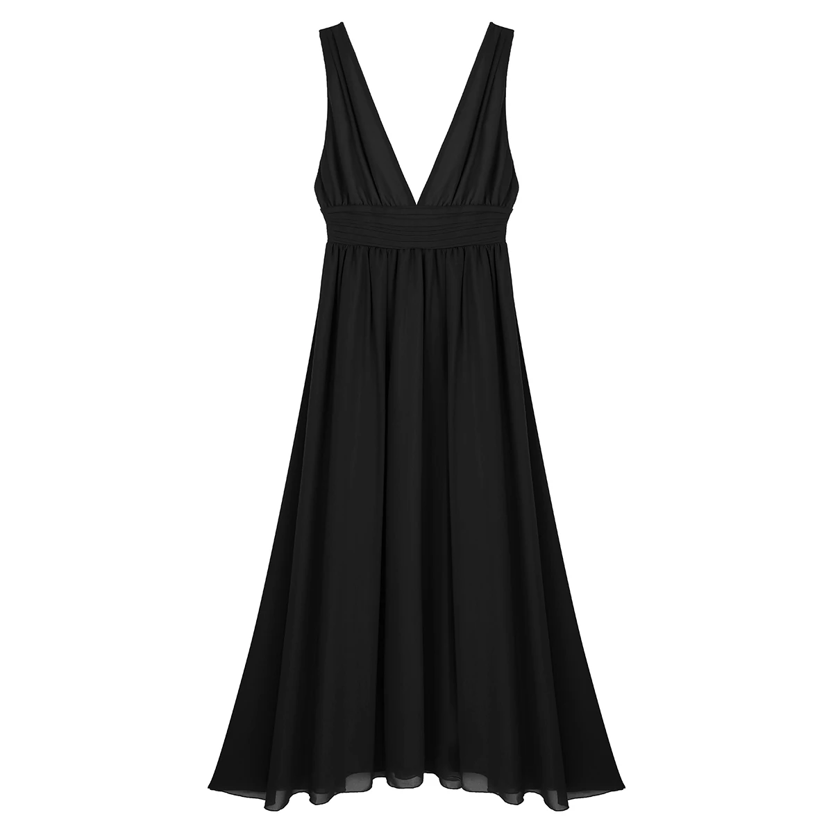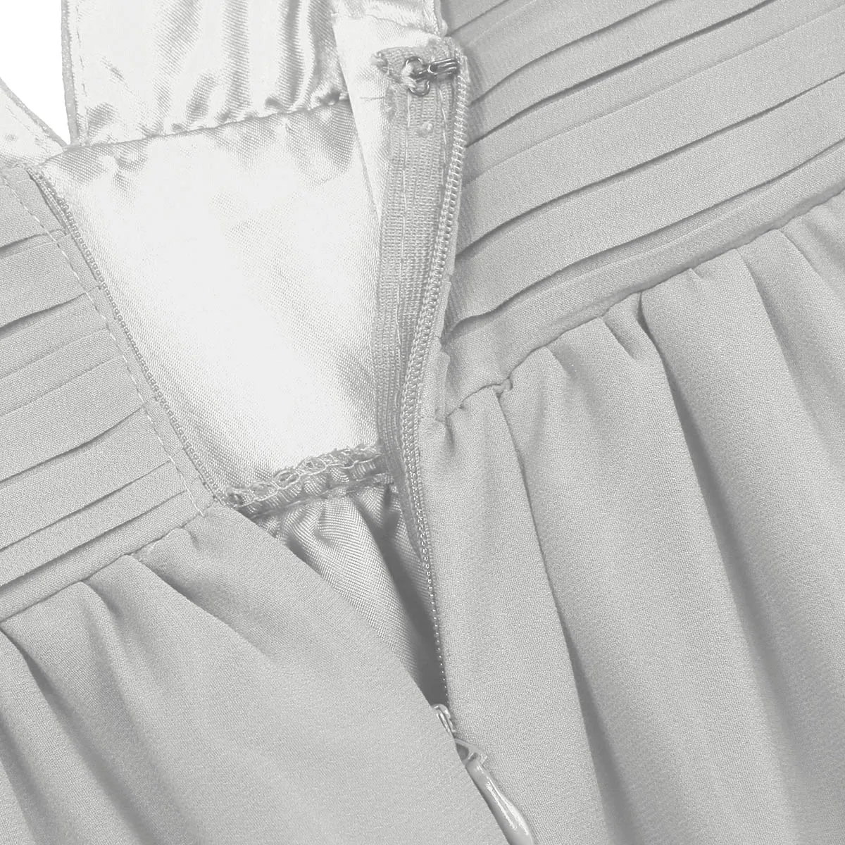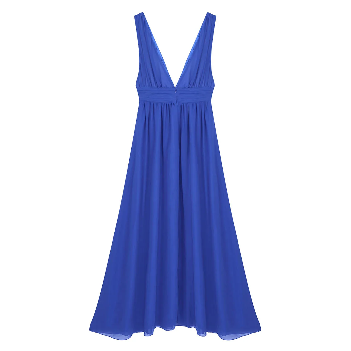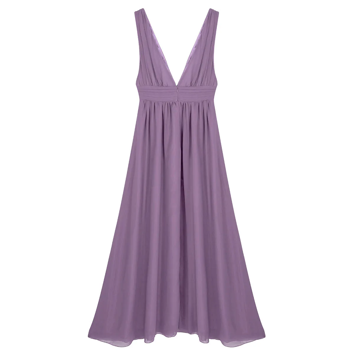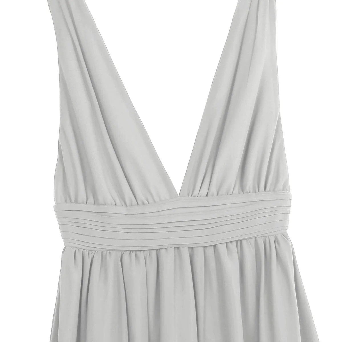 Без рукавов, глубокий v-образный вырез спереди и сзади, скрытая молния сзади с застежкой, плиссированная талия и разрез спереди.