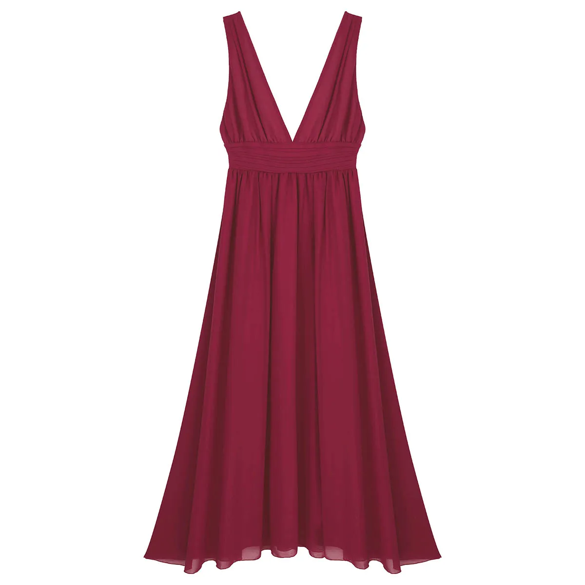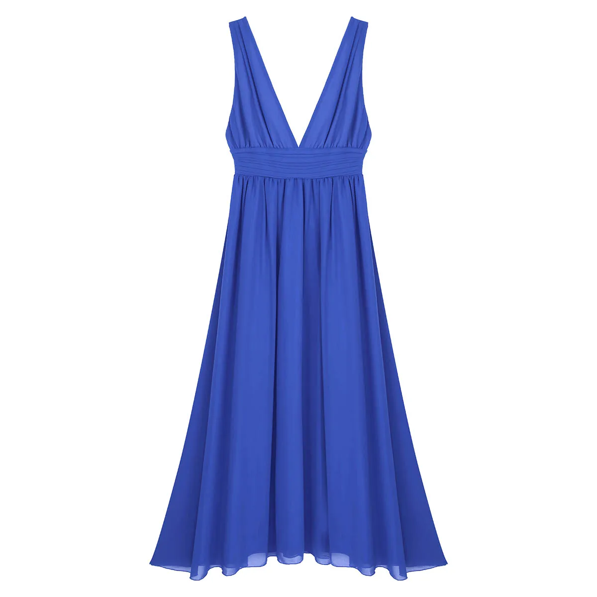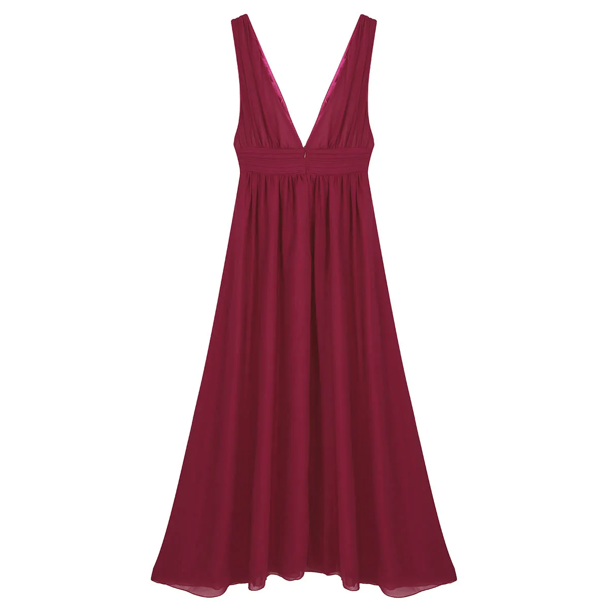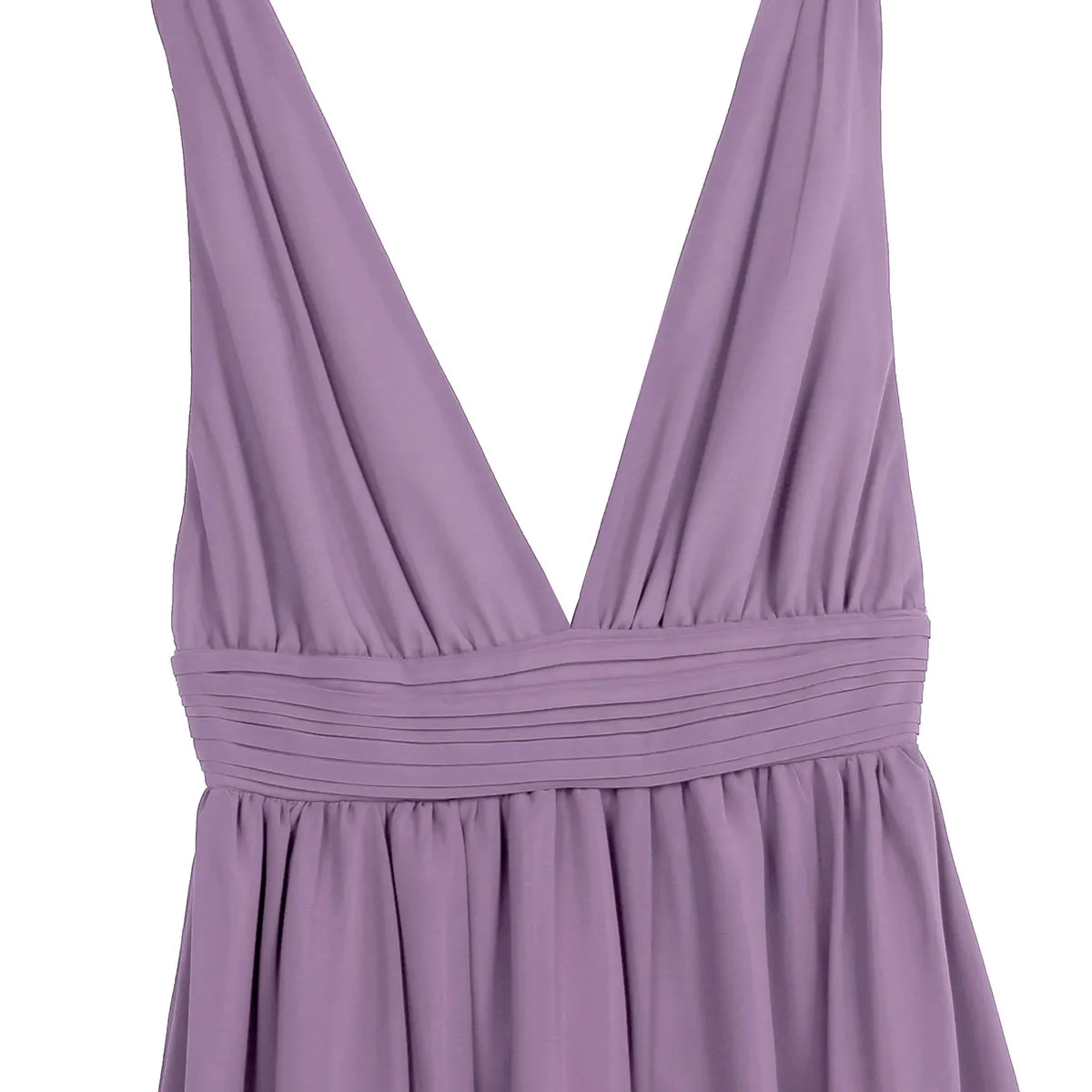 Без рукавов, глубокий v-образный вырез спереди и сзади, скрытая молния сзади с застежкой, плиссированная талия и разрез спереди.