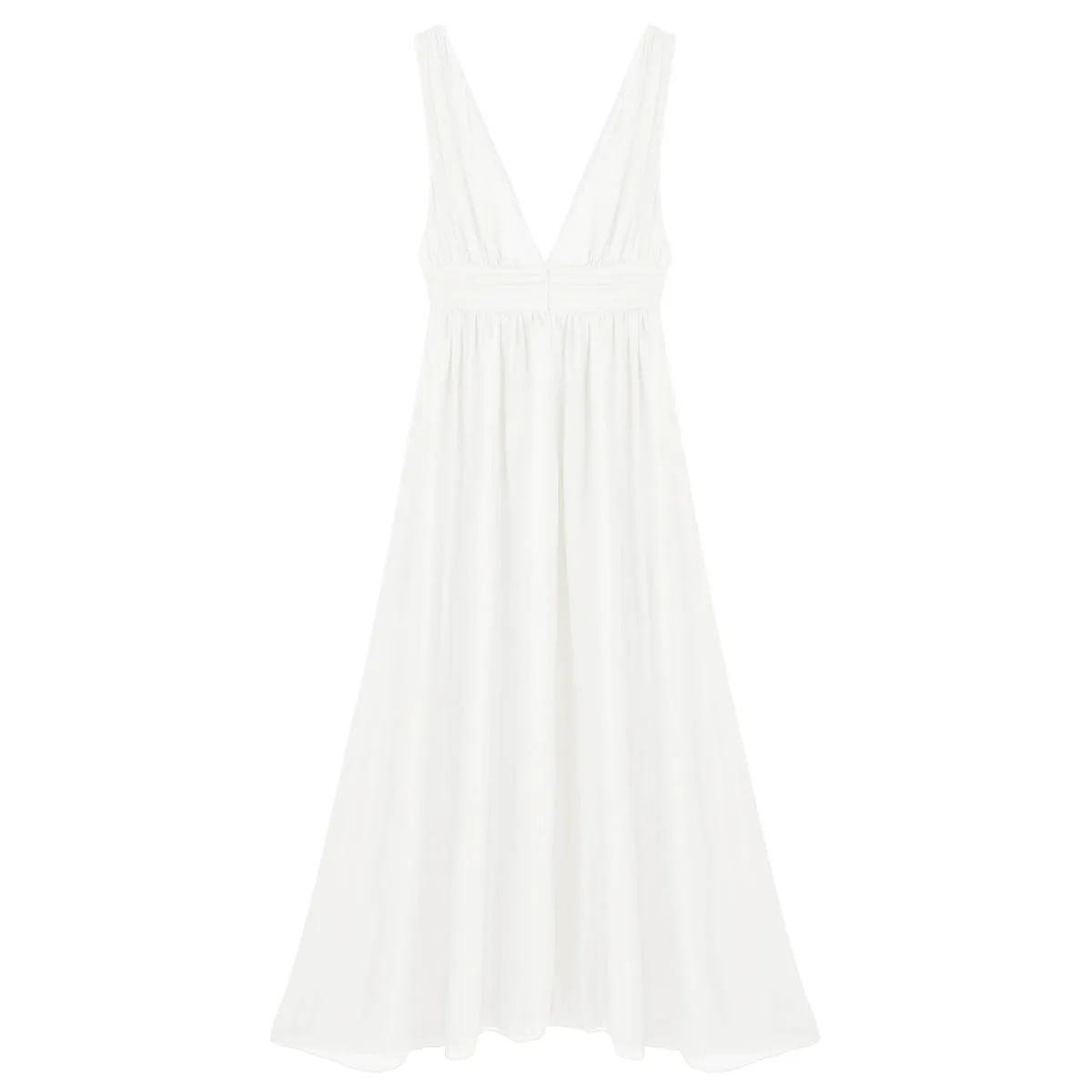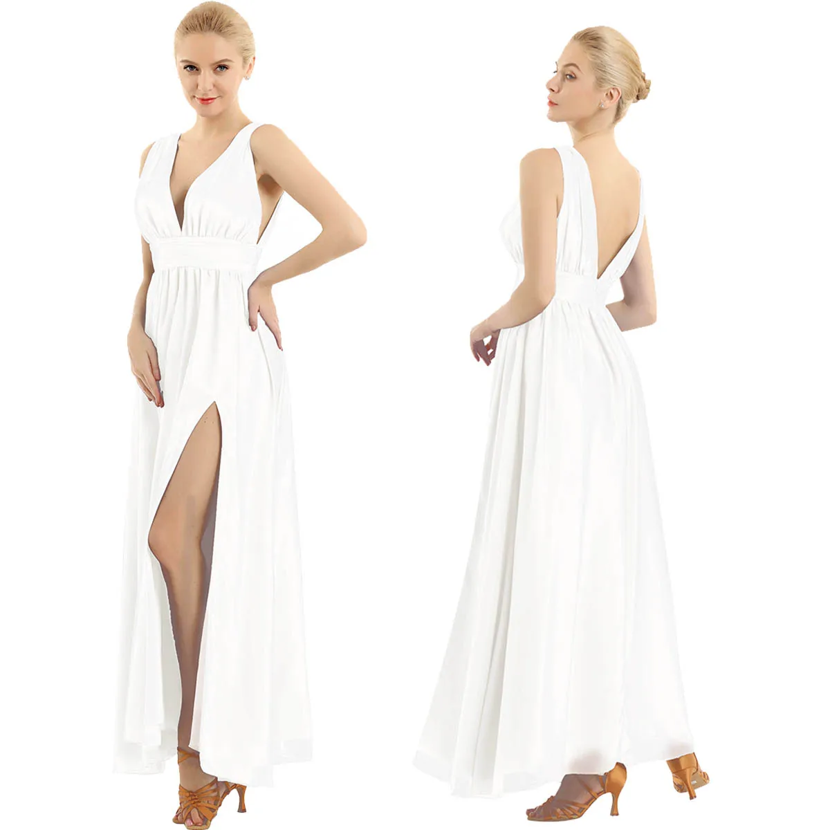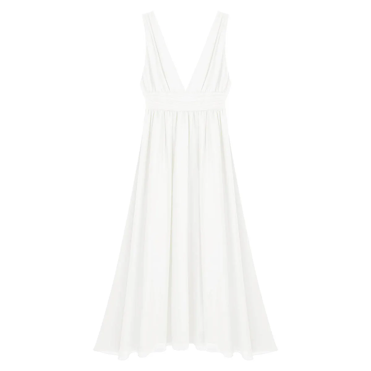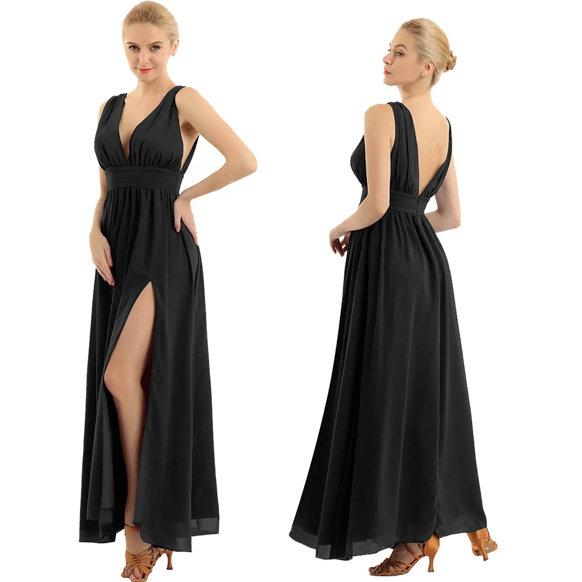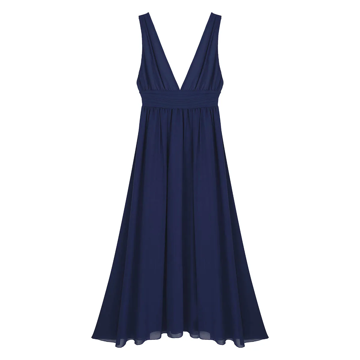 Без рукавов, глубокий v-образный вырез спереди и сзади, скрытая молния сзади с застежкой, плиссированная талия и разрез спереди.