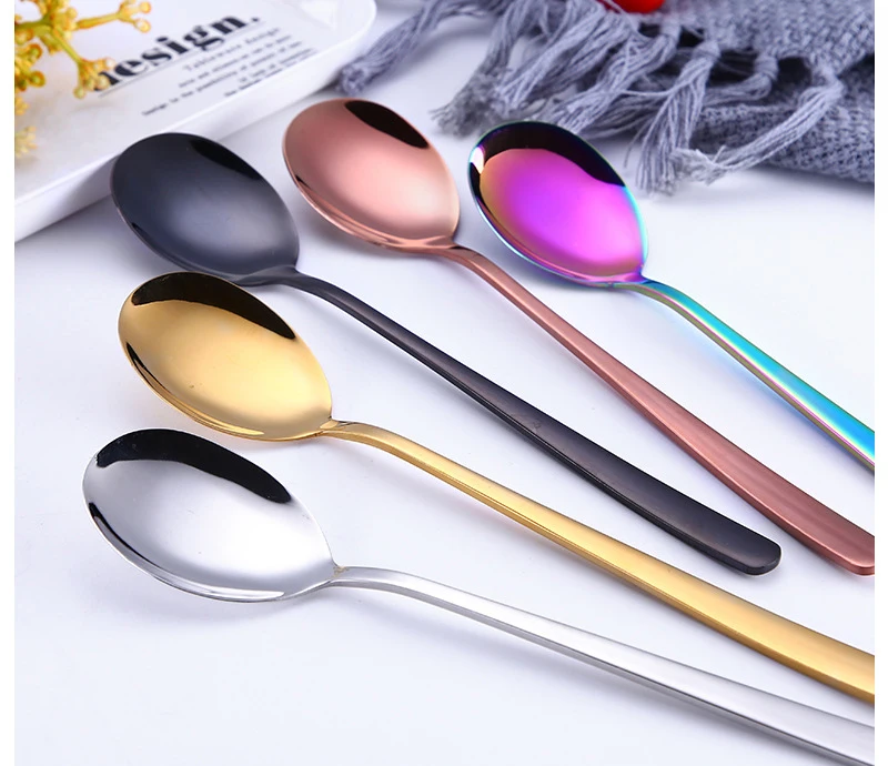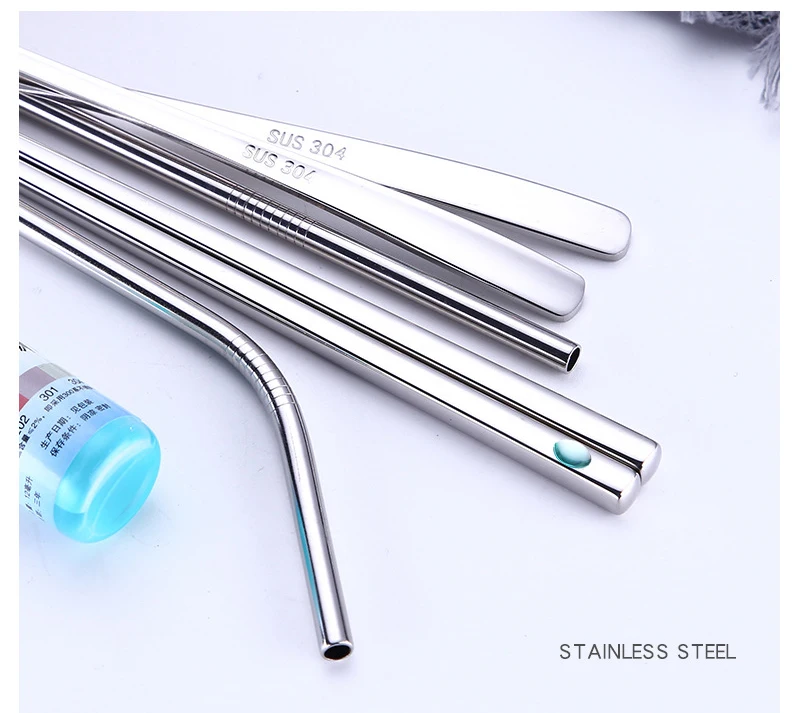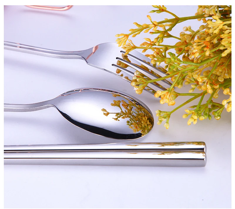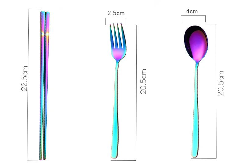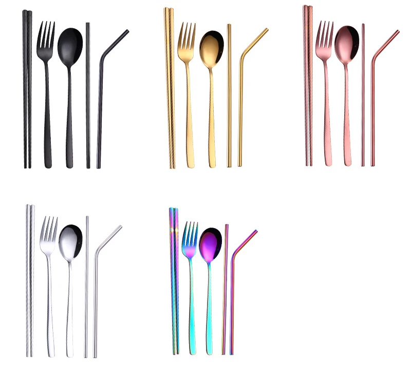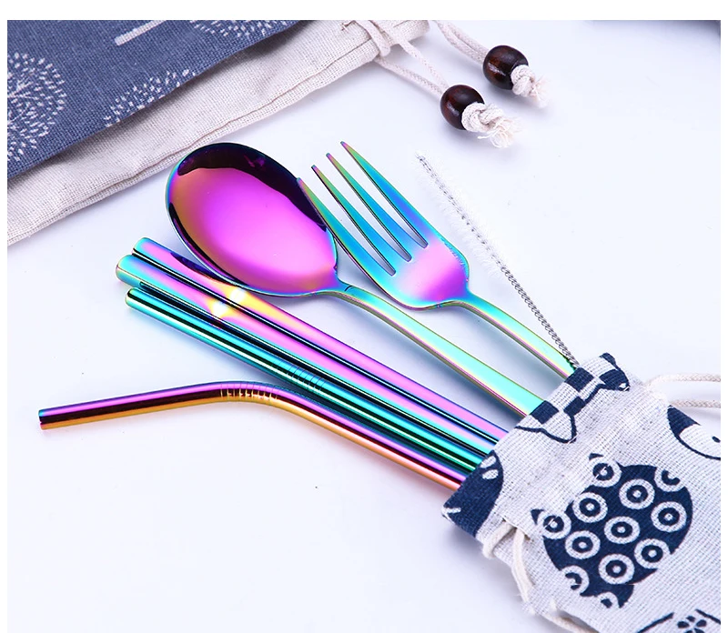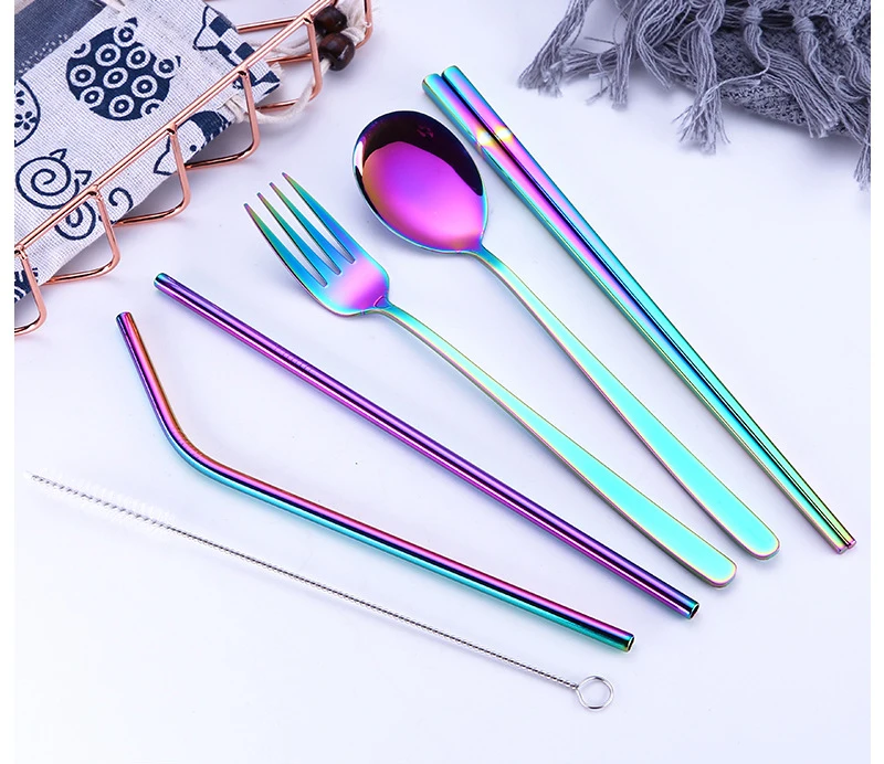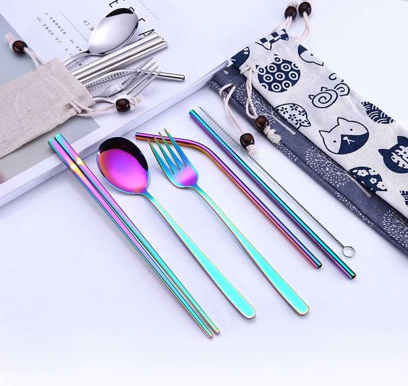 7Pcs Portable Travel Dinneware Set 304 Stainless Steel Fork Scoop Chopsticks Straw Silverwar Set Rainbow Cutlery with Pouch