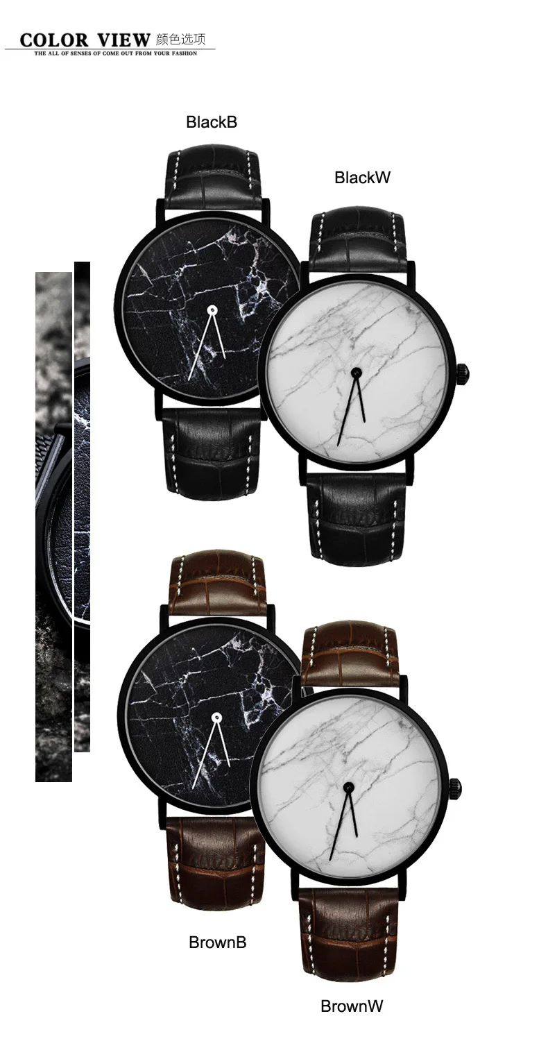* Пожалуйста, посмотрите подробную информацию, как показано ниже * Чехол для часов: сплав с тонким покрытием (черное покрытие) * Ремешок для часов: натуральная кожа * Водонепроницаемость 30 метров отвечает потребностям повседневной жизни * Общая длина: 24 см диаметр мужчины: 4 см толщина 0.6см * Для предпочтений молодых людей Креативный дизайн/простой дизайн пряжки Ультратонкий чехол cool black fashion.Black marble grain