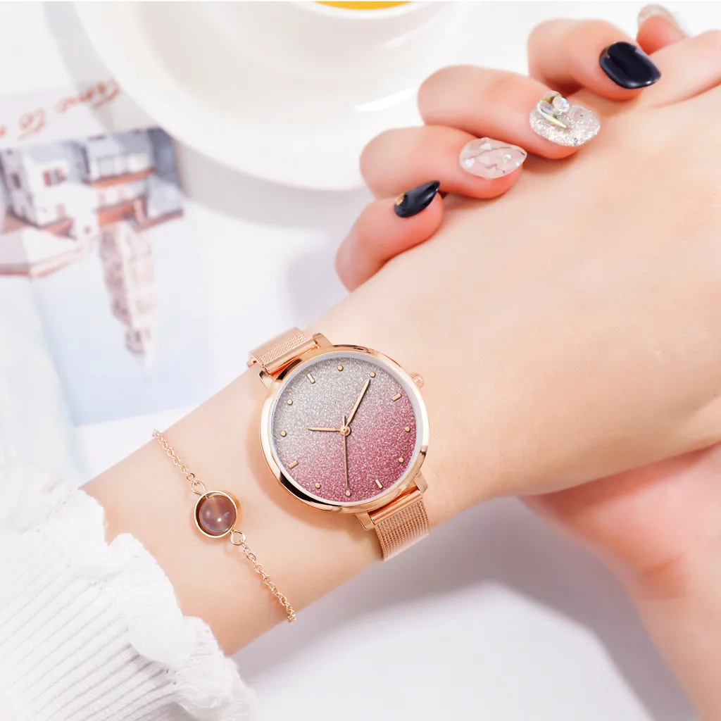 Модные Простые Женские часы с цветным крутым матовым циферблатом, кварцевые наручные часы с ремешком-сеткой