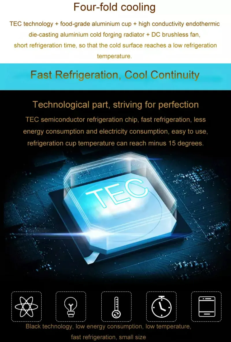 5. Быстрое охлаждение и сильный непрерывный эффект. Компактный и удобный, Стильная форма, емкость чашки 380 мл, Противоскользящий коврик на дне