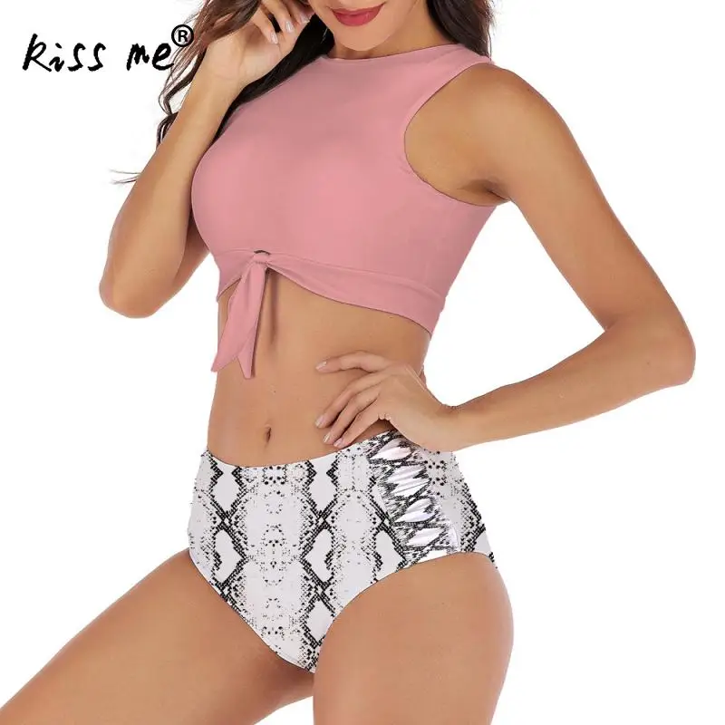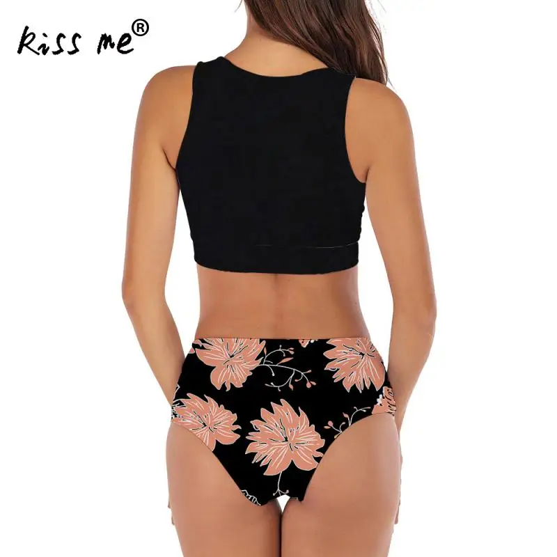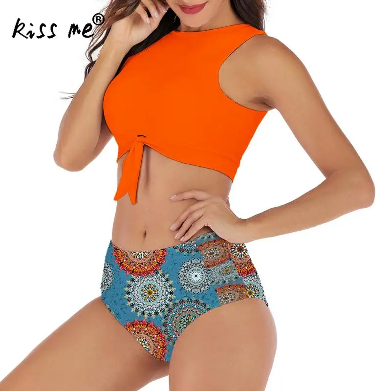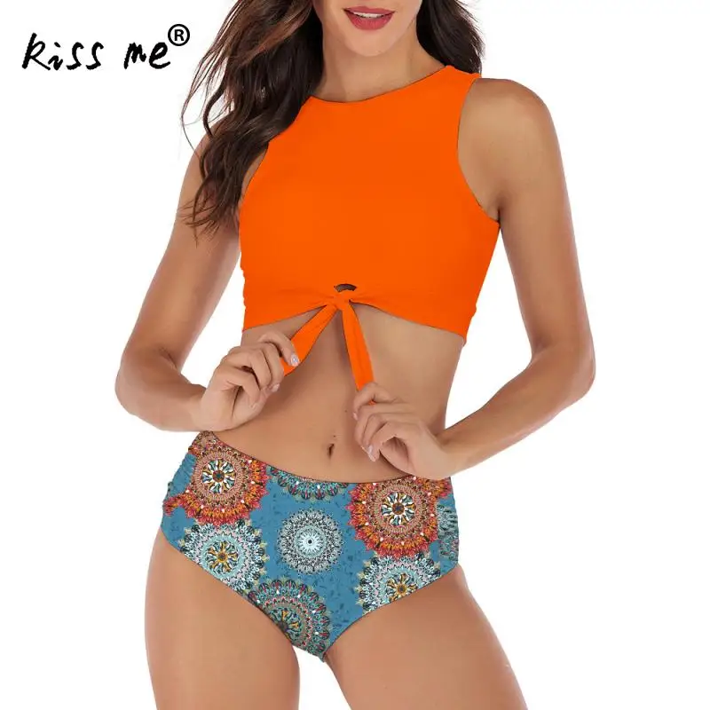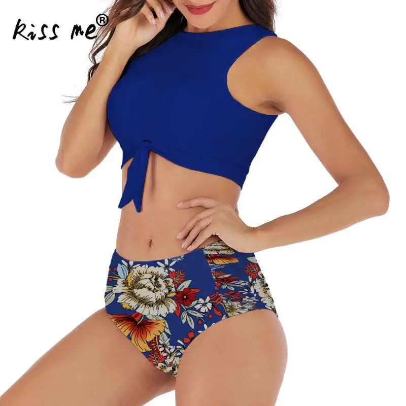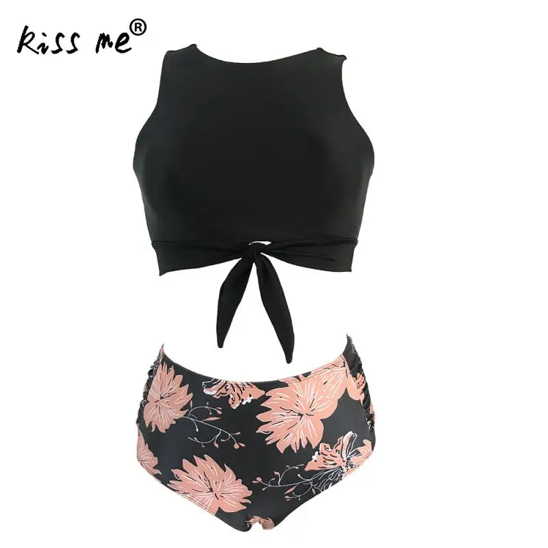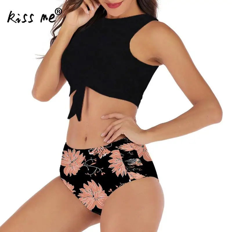 Женский раздельный купальник Tankinis, купальный костюм с цветочным принтом и бантом спереди, пляжный купальный костюм, открытое бикини с высокой талией