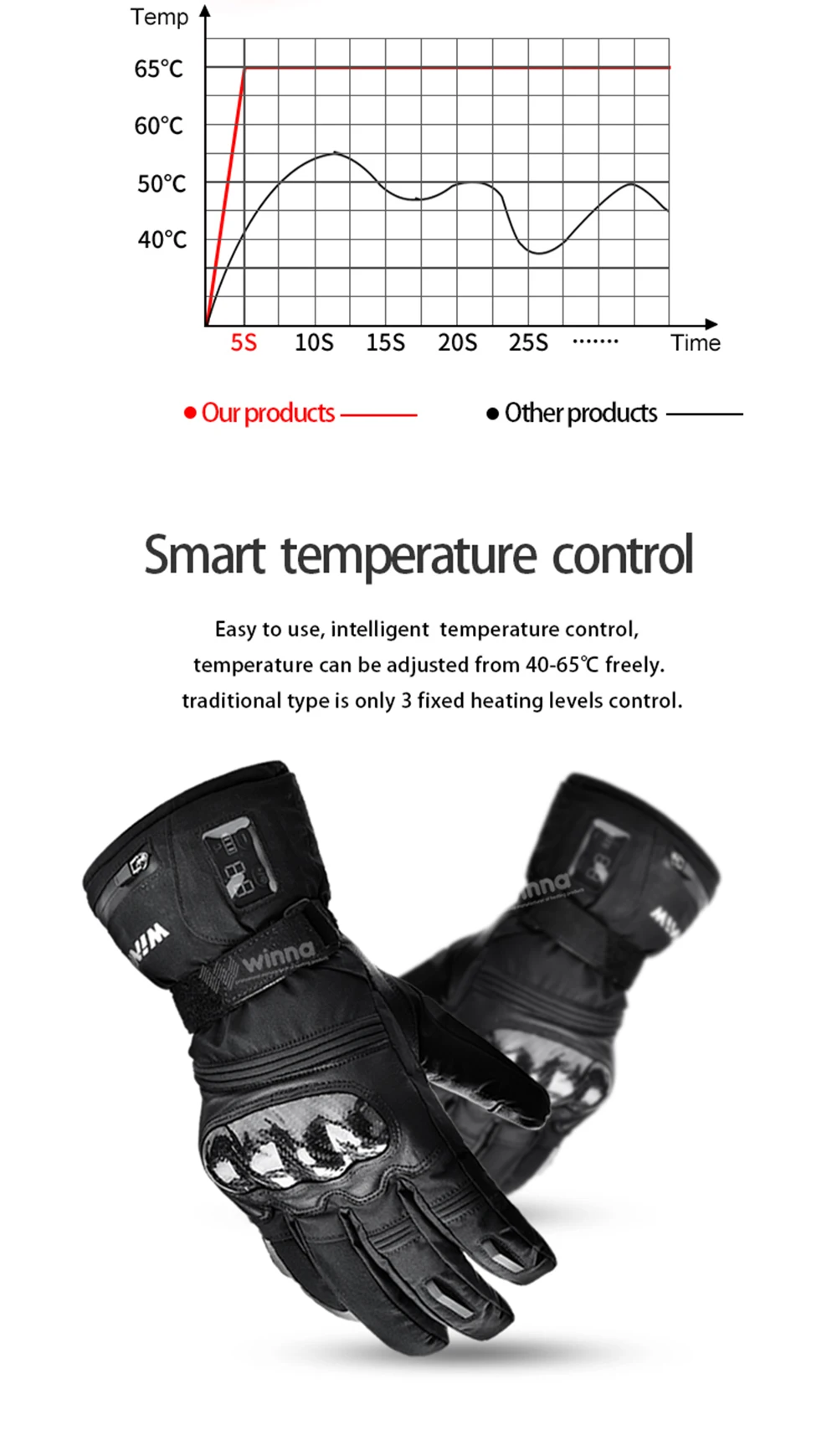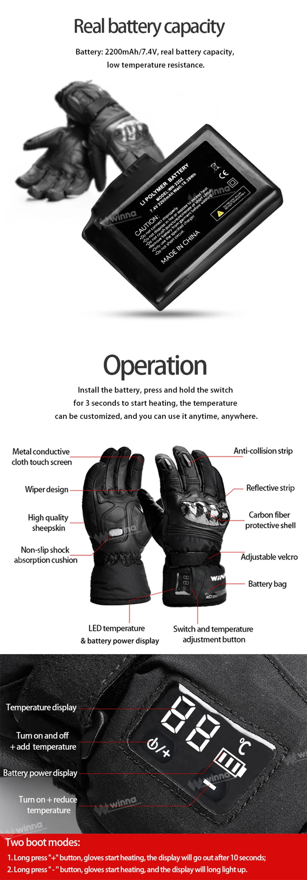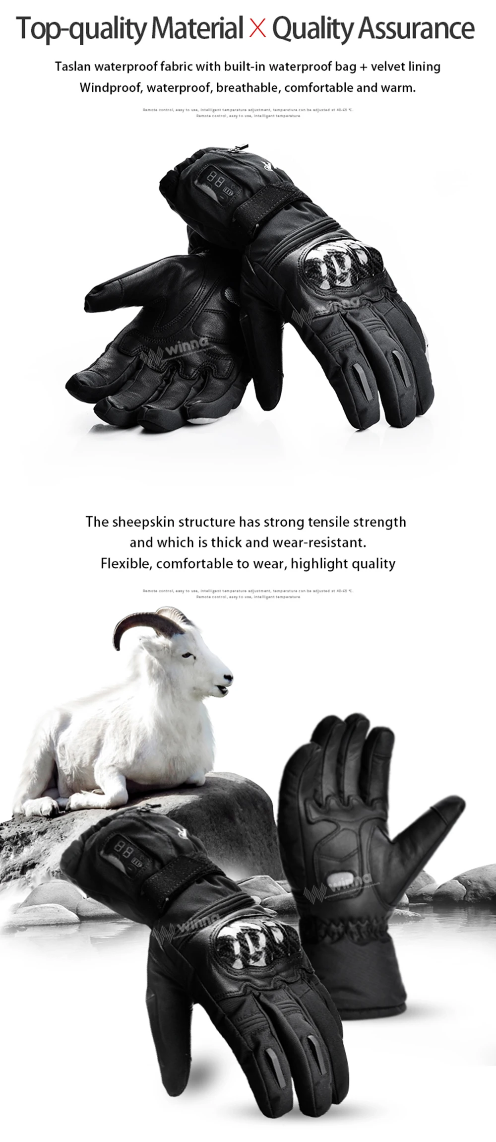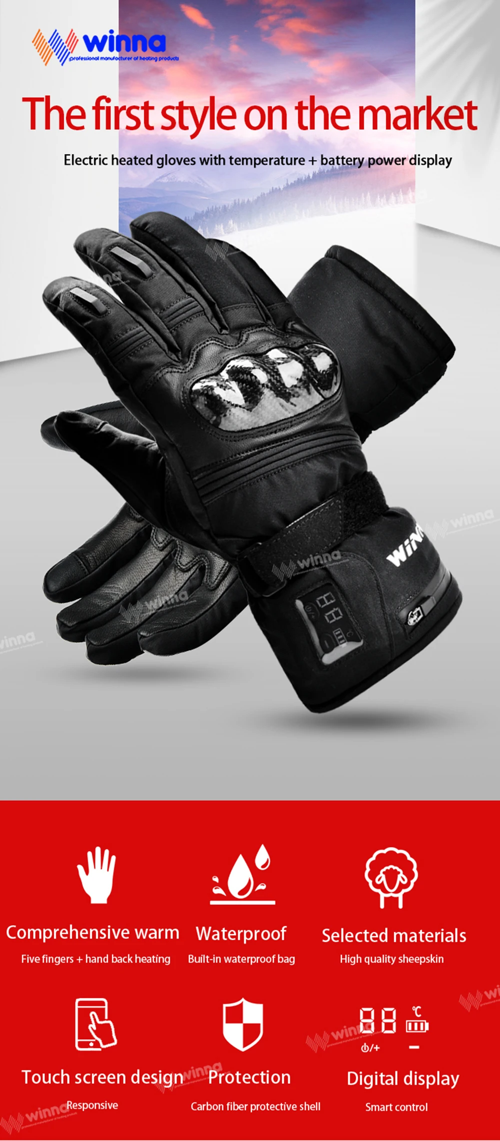 Модель: WNGH3 Размер: M, L, XL, XXL Люди используют: Unsex. Материал: tower velvet водонепроницаемая ткань, бархат, хлопок, защитный чехол из углеродного волокна. Цвет: черный Площадь нагрева: 5 пальцев и задняя сторона Контроль: цифровой контроль температуры l Диапазон температур: 40 ℃-65 ℃ Особенности: ветрозащитные и водонепроницаемые, перчатки с сенсорным экраном Применимо: для езды на мотоцикле, езды на велосипеде, катания на лыжах, скейтбординга и т. д.Информация о продукте: