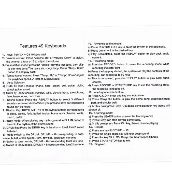 2,49 ключей мягкая клавиатура, которая имеет 8 барабана режимов, один ключ для одного вида транспорта, 16-уровневый регулятор громкости, 32-уровня ритм управление и энергосберегающий режим сна